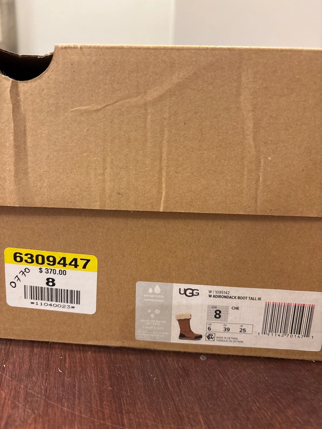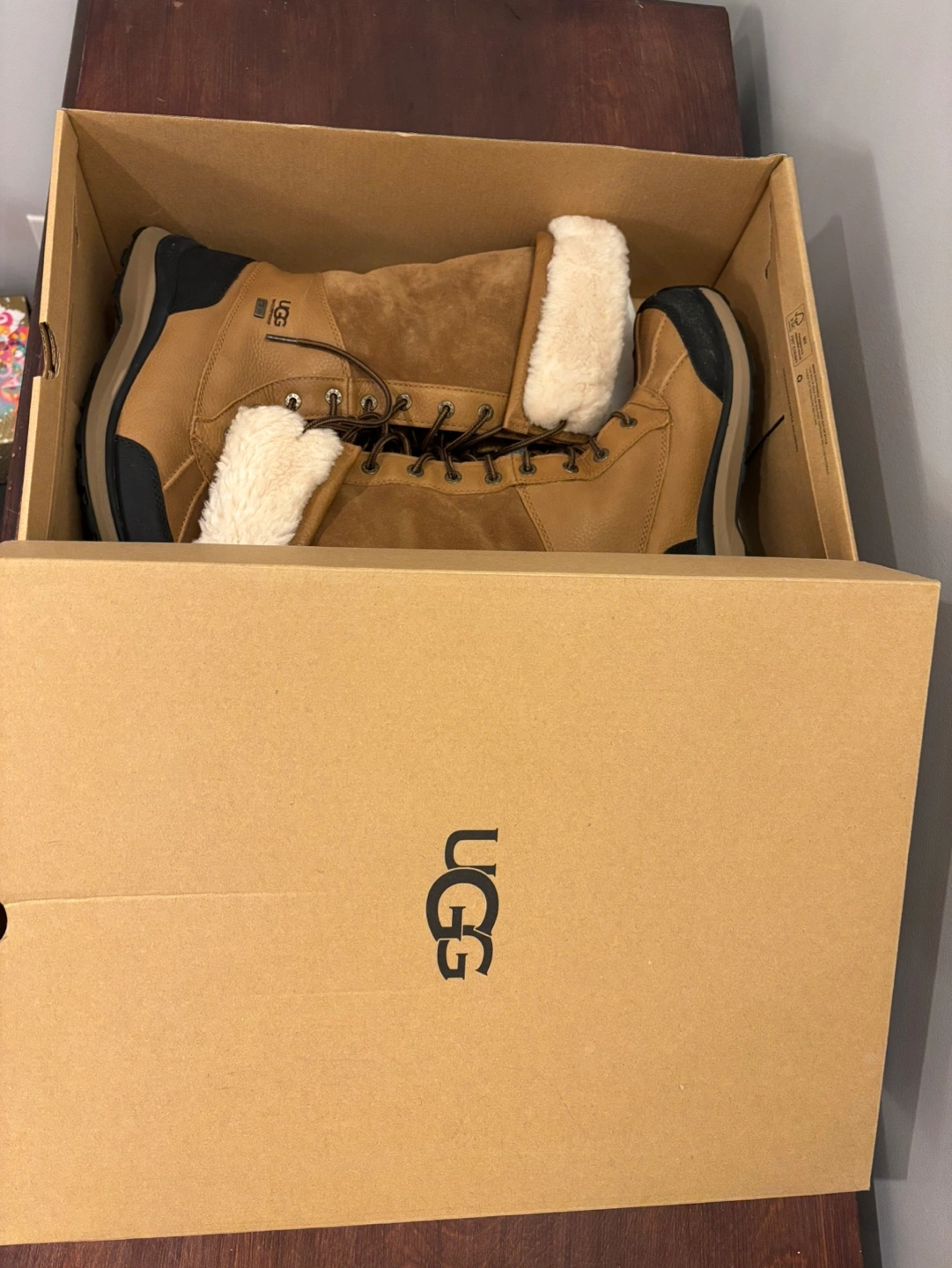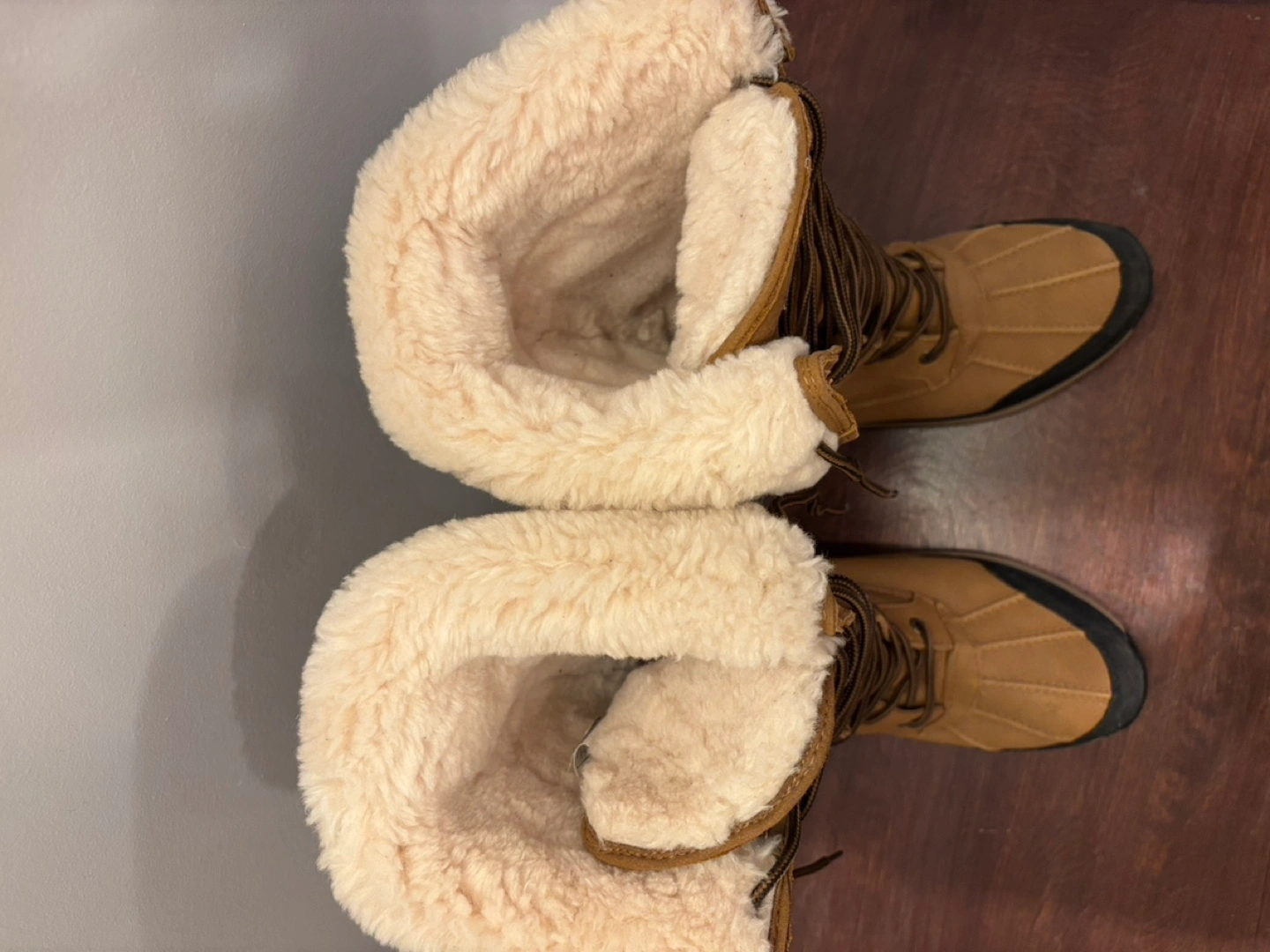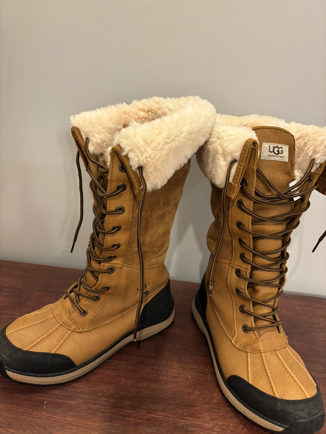 Brown leather winter boots with a fur lining and a black rubber sole. Lace-up closure with a zipper on the side. Come with original box. bought wrong size
