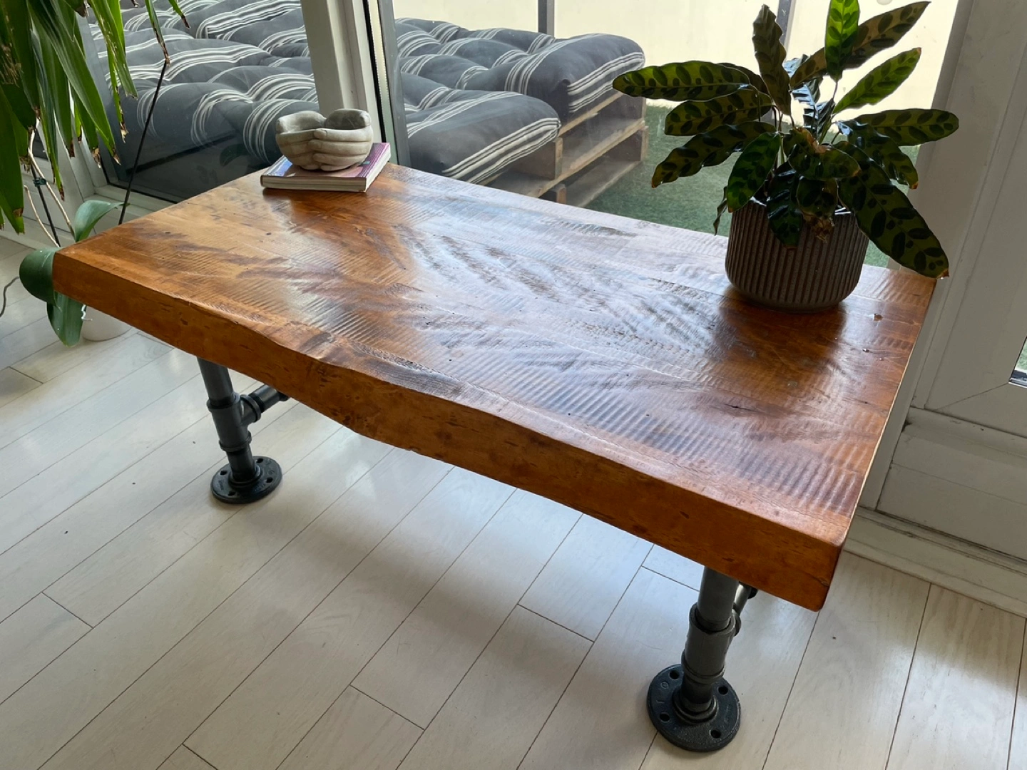 Live edge coffee table with industrial pipe legs. Solid wood top.