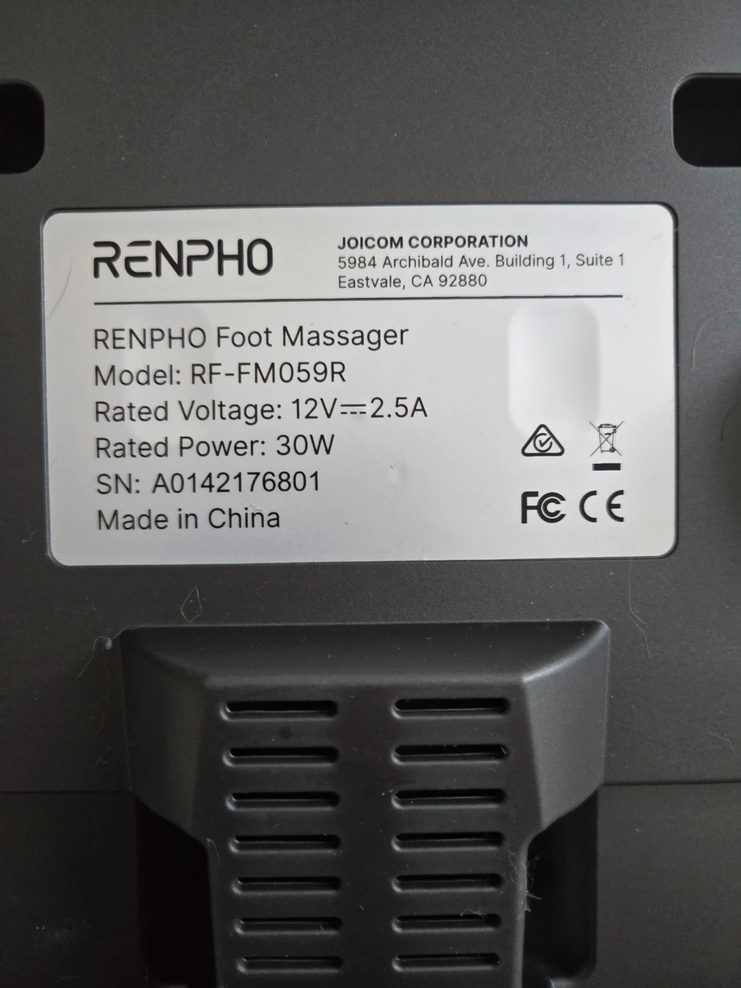 RENPHO Foot Massager, model RF-FM059R. Features adjustable massage intensity, air compression, and heat functions. Rated 12V, 30W. A great way to relax tired feet!