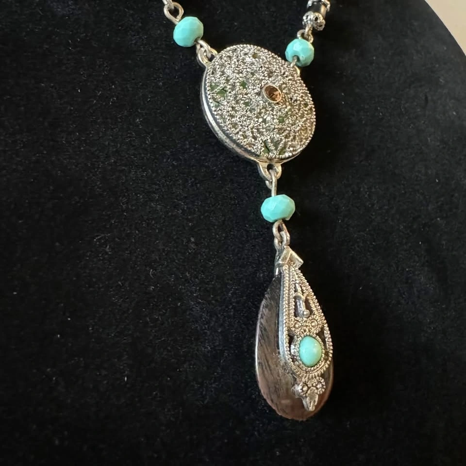 Beautiful silver tone necklace with wood-like and black/turquoise coloured beads (possibly lucite) in lovely vintage condition—lovely filigree medallion pendant that looks like a dreamcatcher! Vintage Nina Ricci for Avon Has the NR hallmark of Nina Ricci for Avon. Signed NR on the back of the pendant and is likely from the 70s/80s. Let me know if you have any questions or require more photos/videos. Photos/video were taken by the window in evening light.