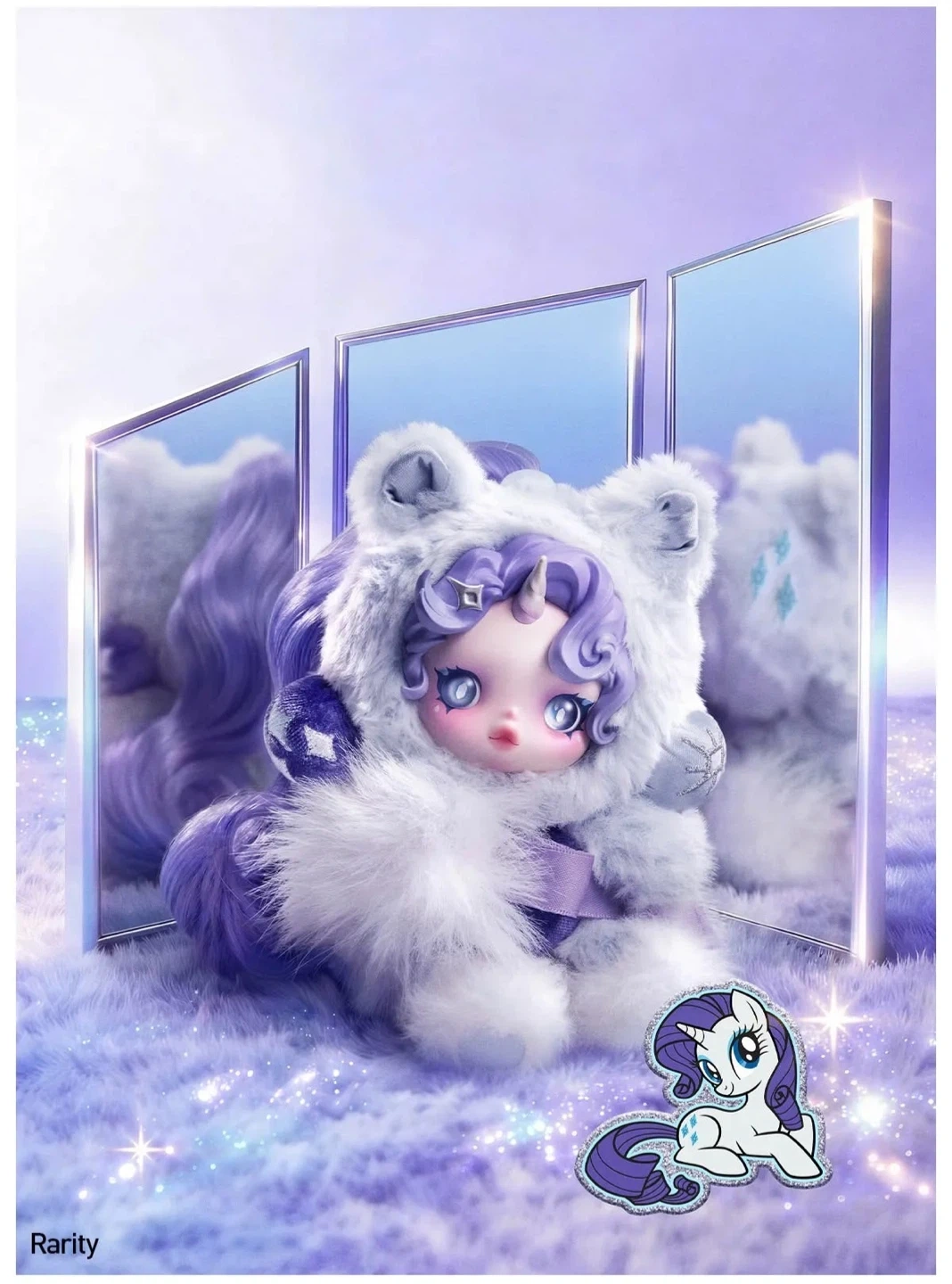 This is a blind box doll featuring a Rarity unicorn design. It's made with soft plush material and detailed face sculpt. Comes with purple wavy hair and a fluffy white and grey costume.