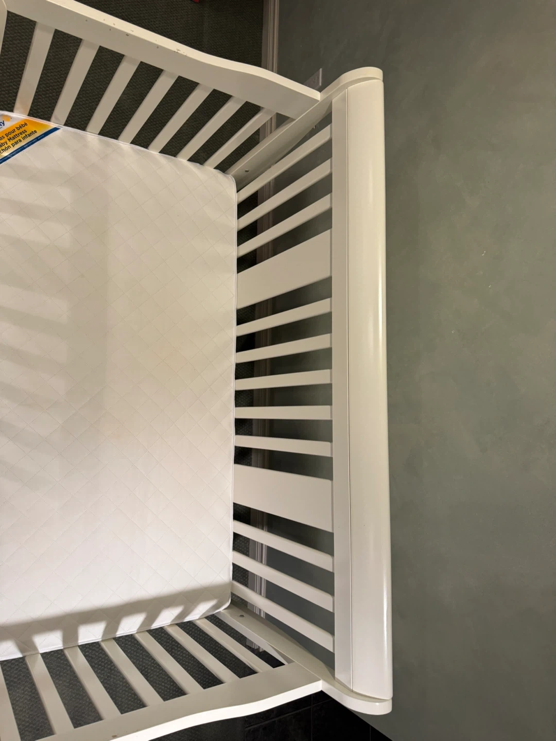 A sturdy white baby crib, perfect for your little one's nursery. It comes with a comfortable mattress. This crib is designed for safety and durability.