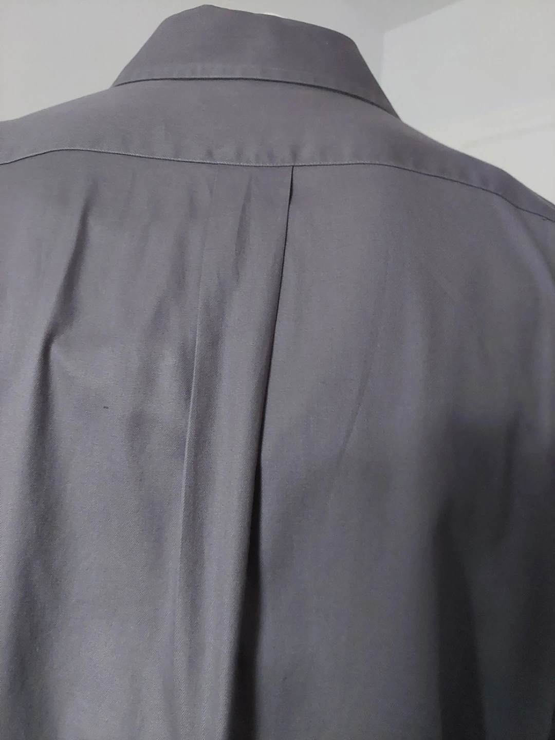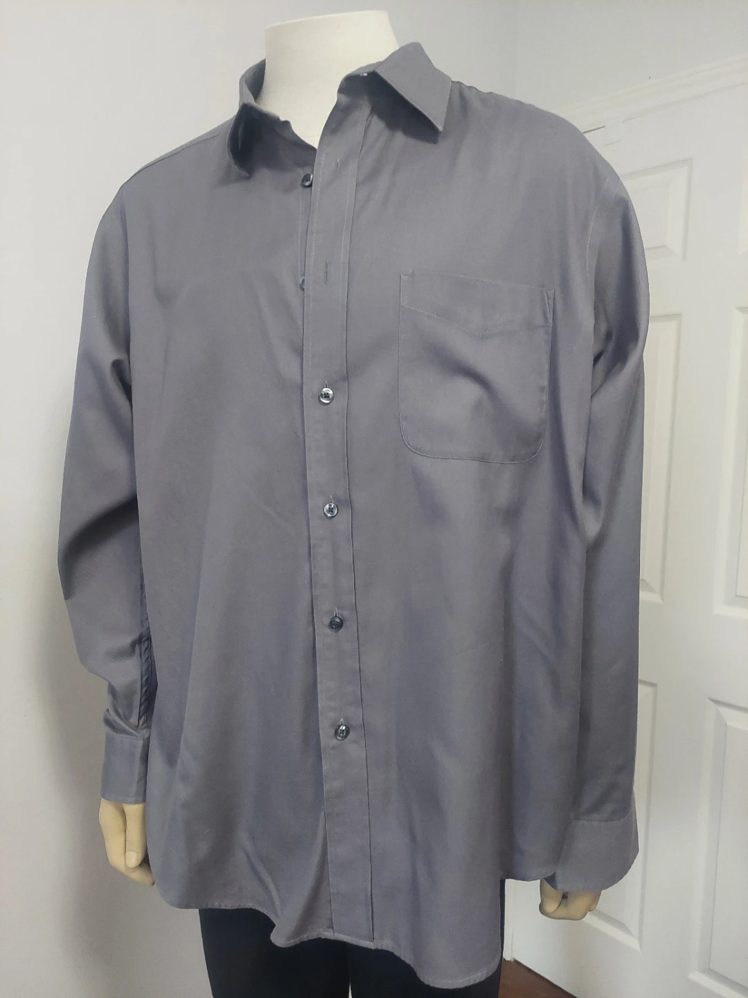 This is a men's long-sleeve dress shirt from Roundtree & Yorke. It's a size large and made of 100% cotton. The shirt is grey and features a button-up front and a single chest pocket. It's a classic button-down style. This shirt would be useful for business casual or formal occasions.