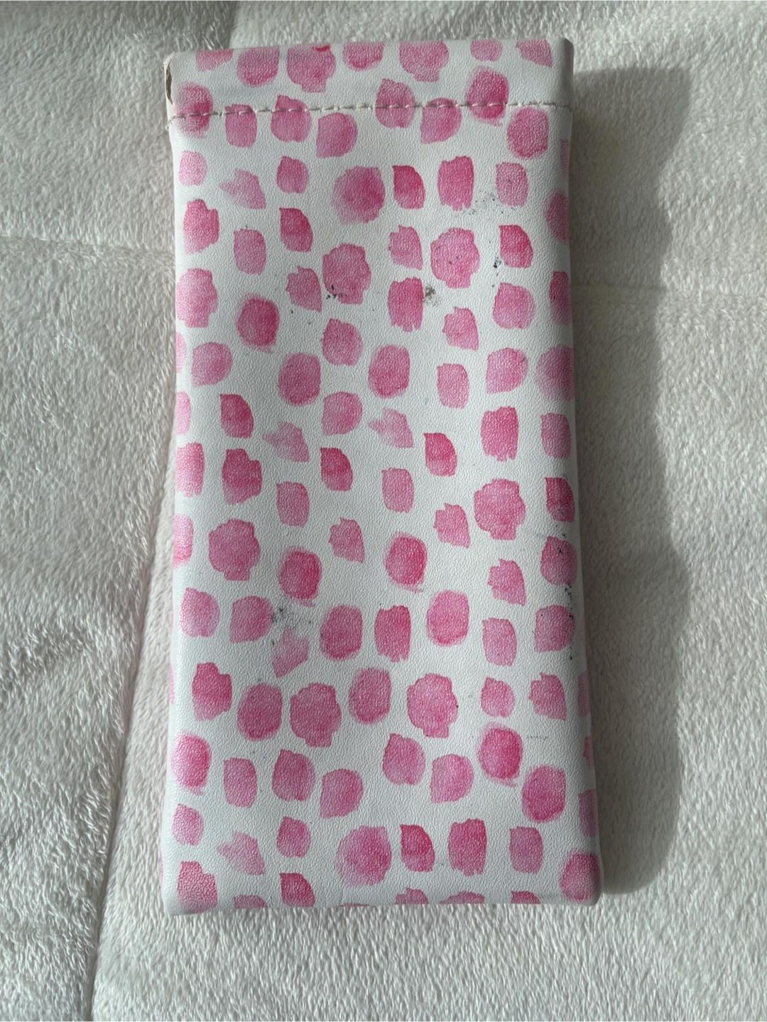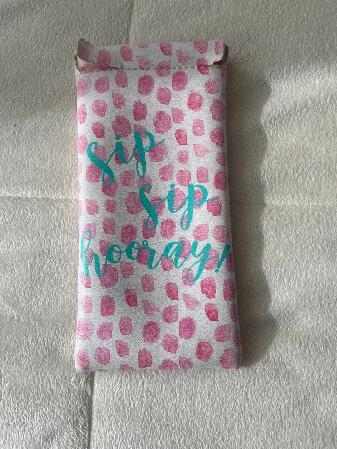 Selling an eyeglasses or sunglasses travel case with a pink polka dot design and 'Sip Sip Hooray!' text.
