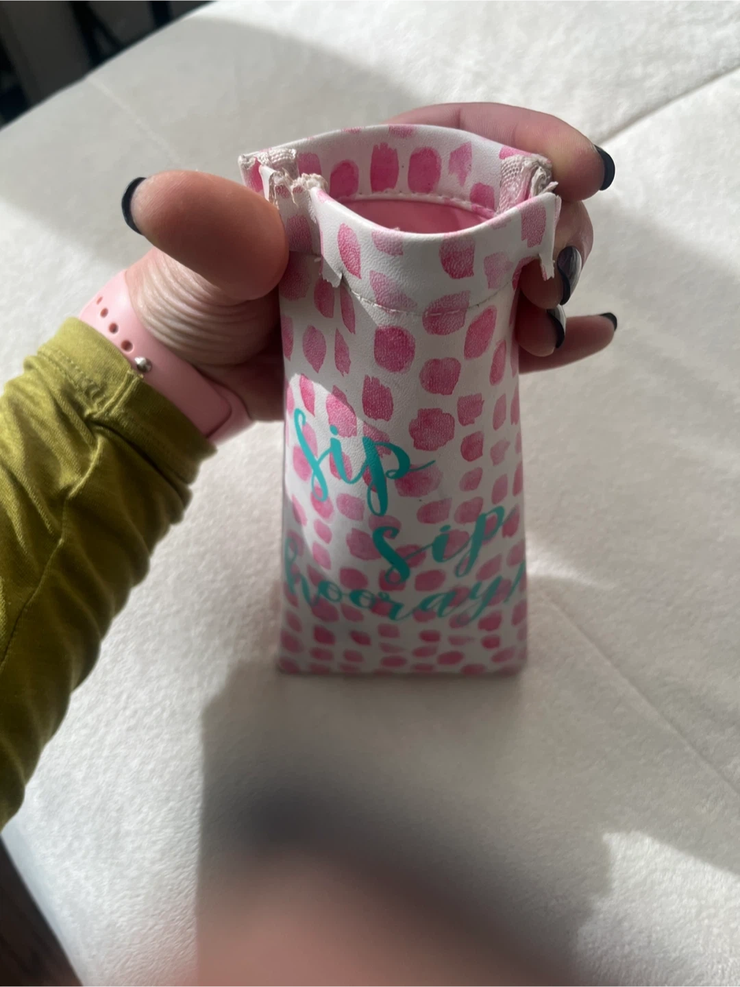 Selling an eyeglasses or sunglasses travel case with a pink polka dot design and 'Sip Sip Hooray!' text.