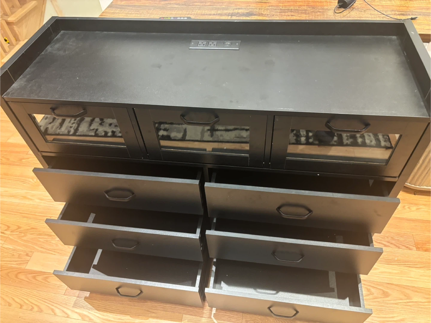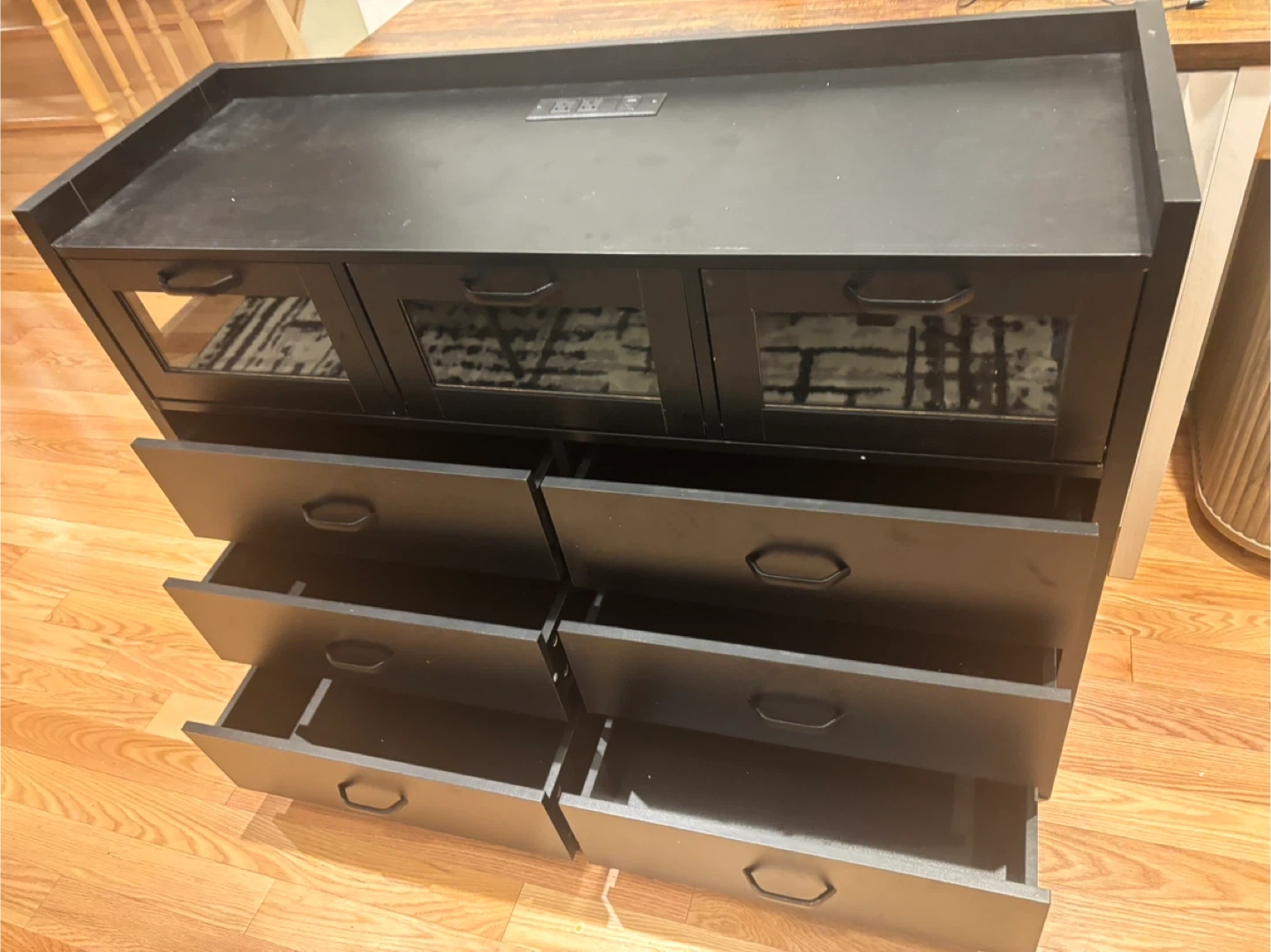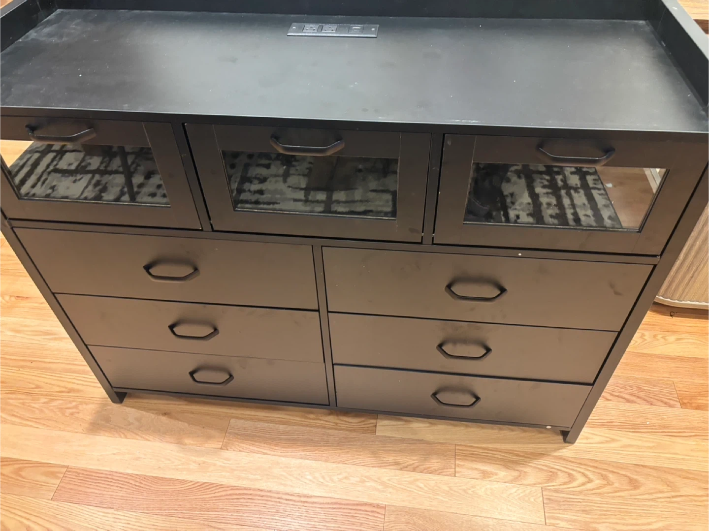 This black dresser features six drawers and three glass-fronted cabinets. It also has a built-in power outlet on the top surface. Great for storage! Available for pickup and delivery.