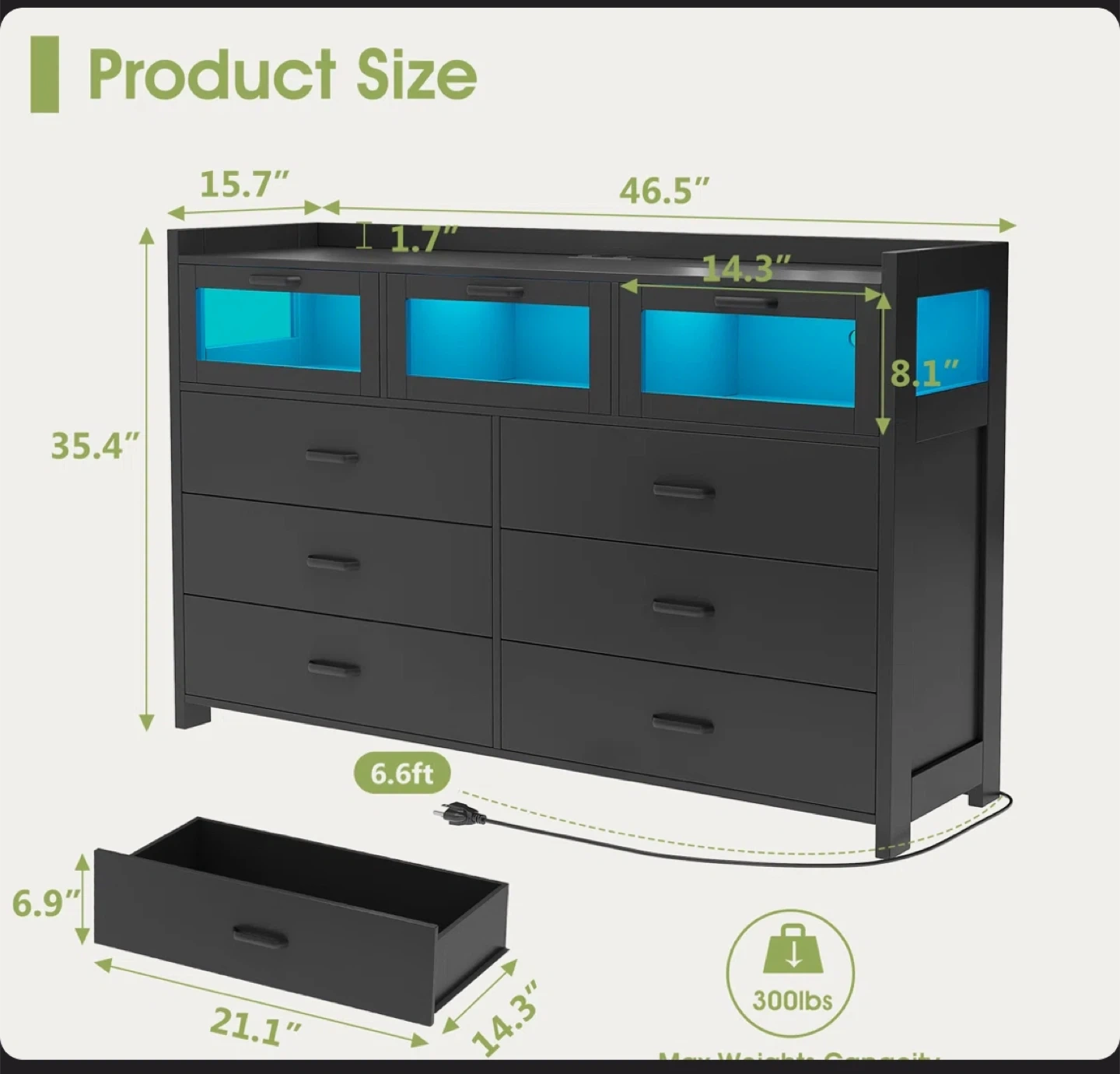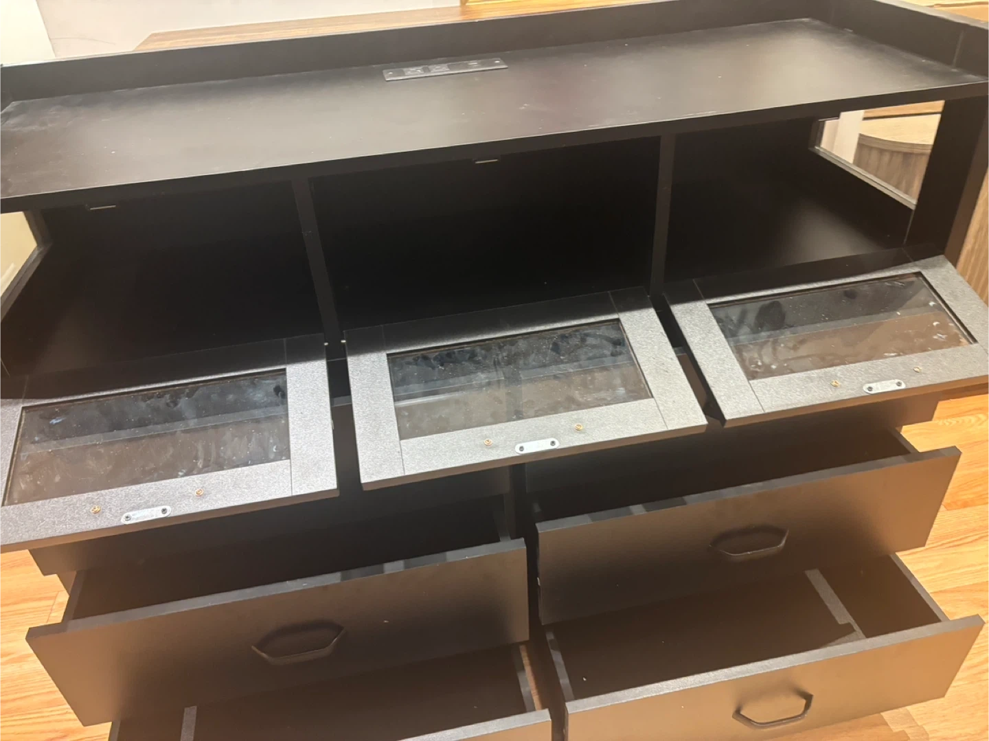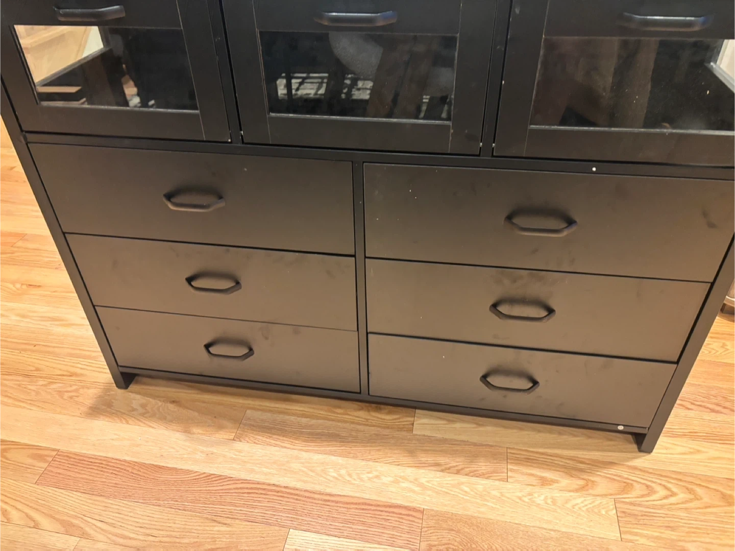 This black dresser features six drawers and three glass-fronted cabinets. It also has a built-in power outlet on the top surface. Great for storage! Available for pickup and delivery.
