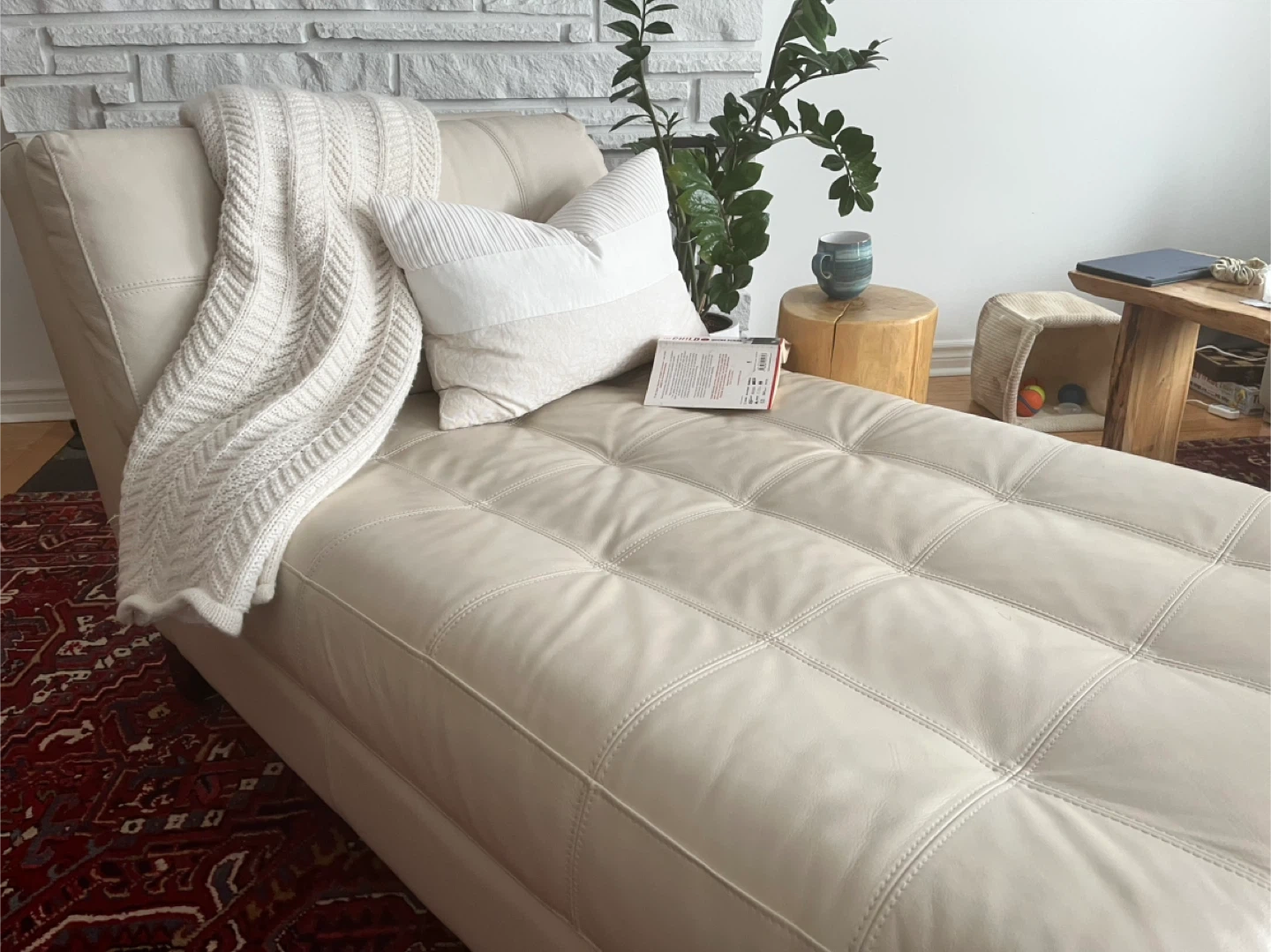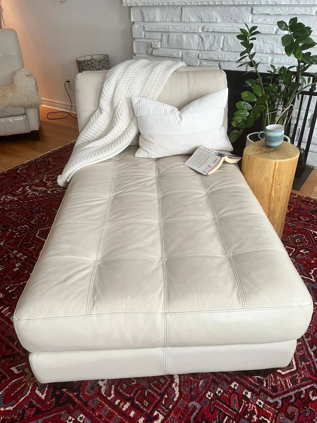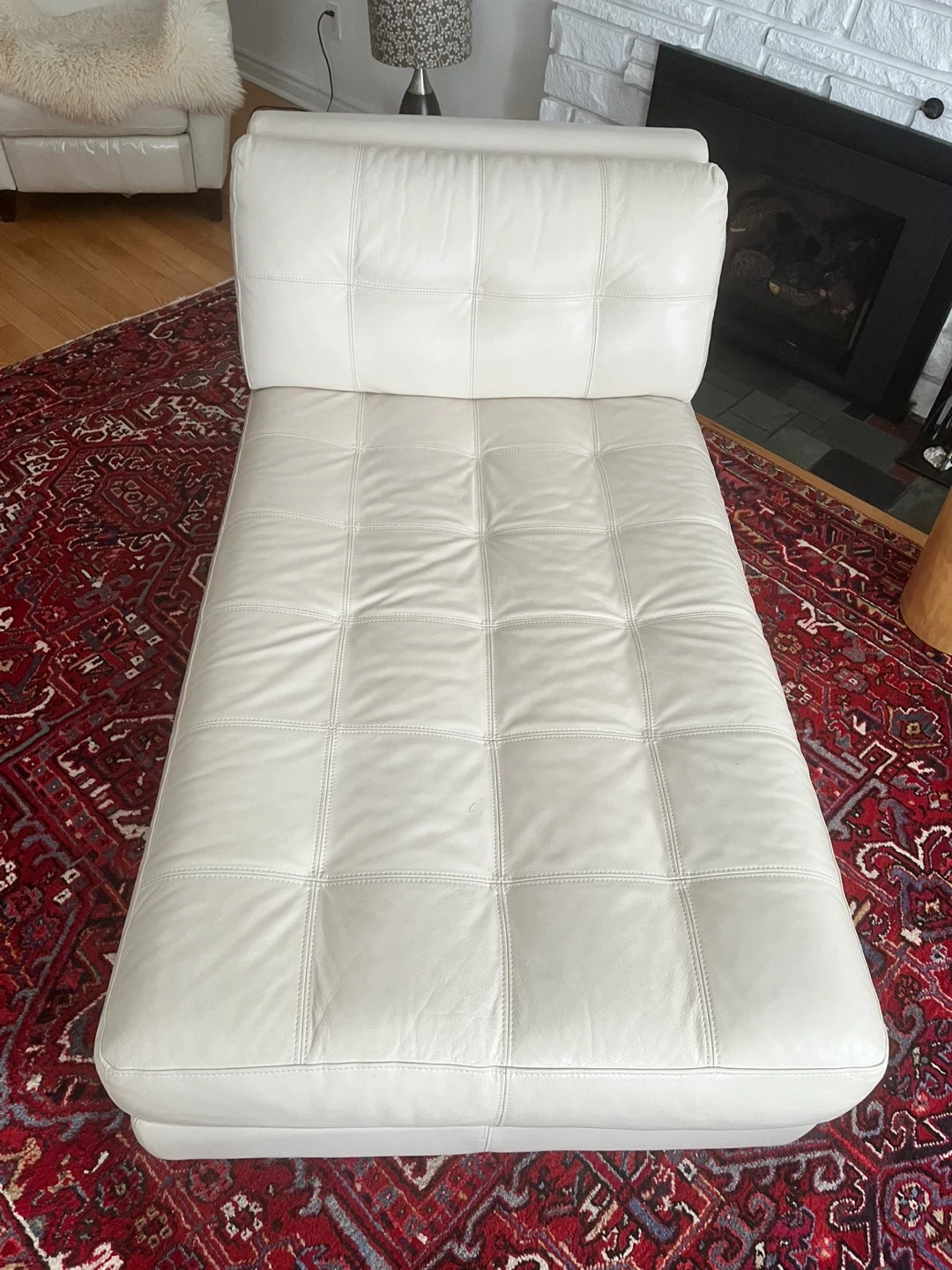 This cream leather chaise lounge offers comfortable seating with a stylish tufted design. It's upholstered in soft leather for a luxurious feel. Perfect for relaxing in your living room or bedroom.