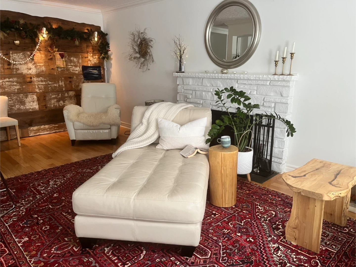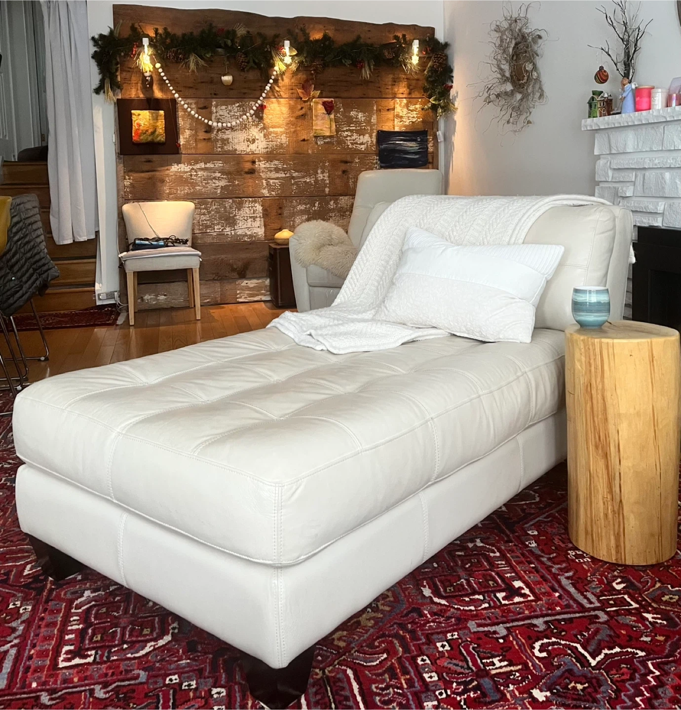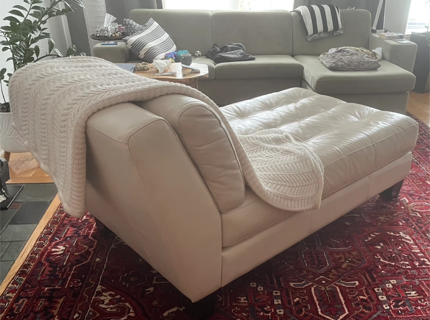 This cream leather chaise lounge offers comfortable seating with a stylish tufted design. It's upholstered in soft leather for a luxurious feel. Perfect for relaxing in your living room or bedroom.