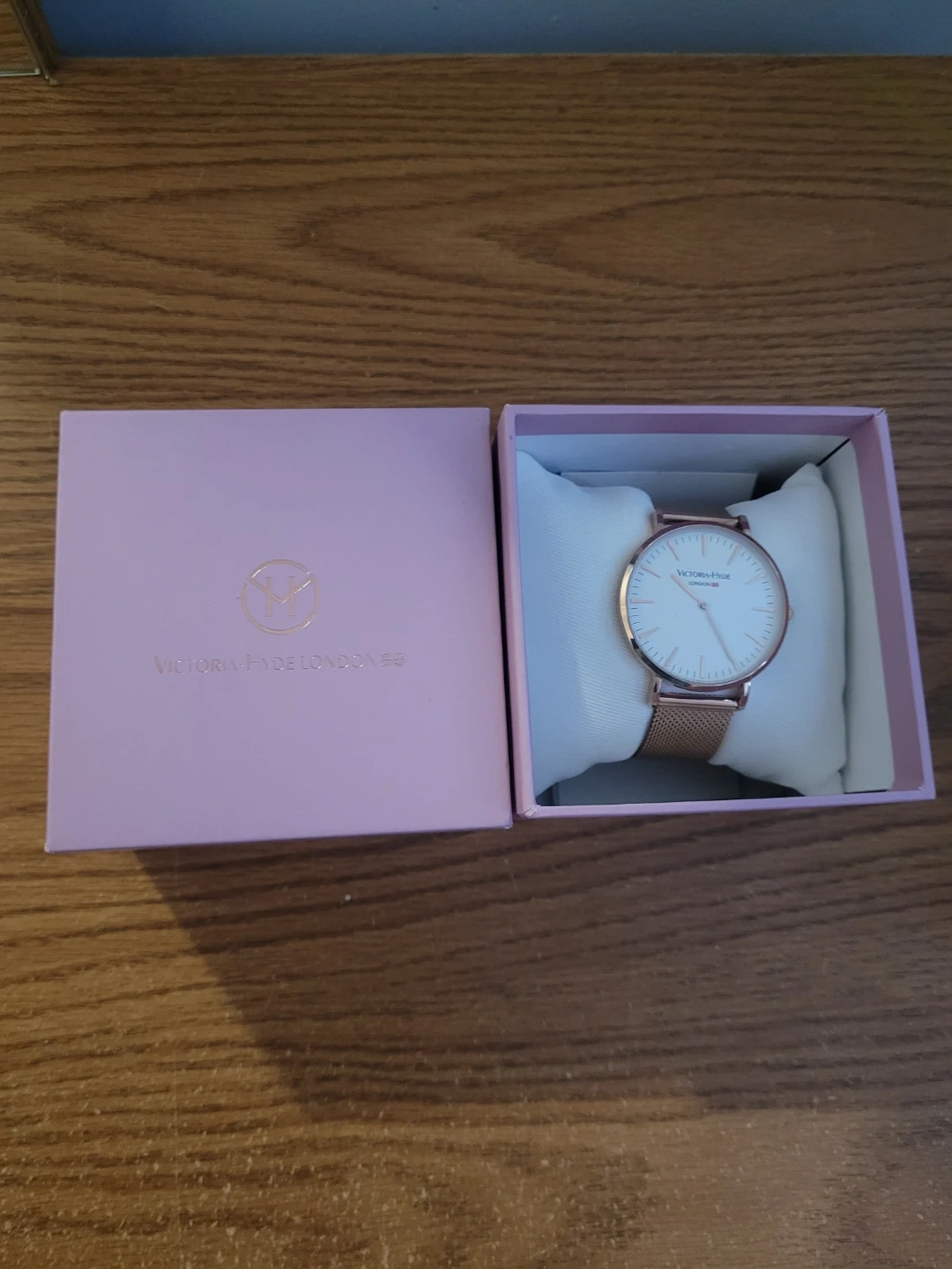 This is a rose gold watch from Victoria Hyde London. It features a white face with rose gold hour markers and a mesh band. Includes the original pink box.