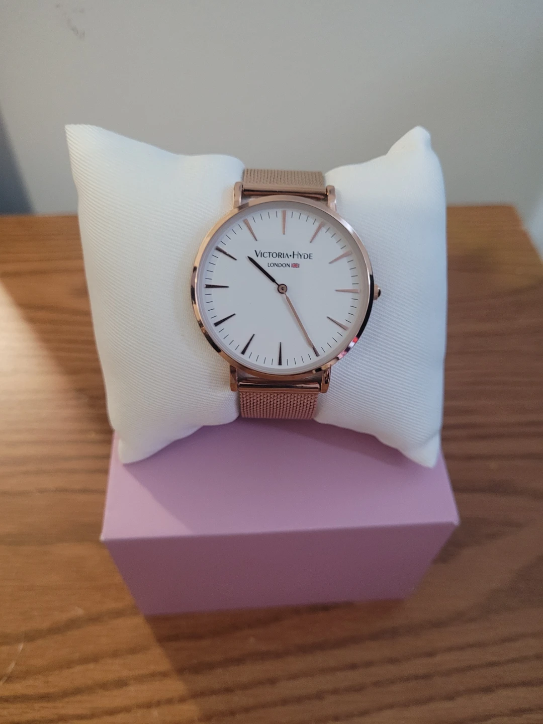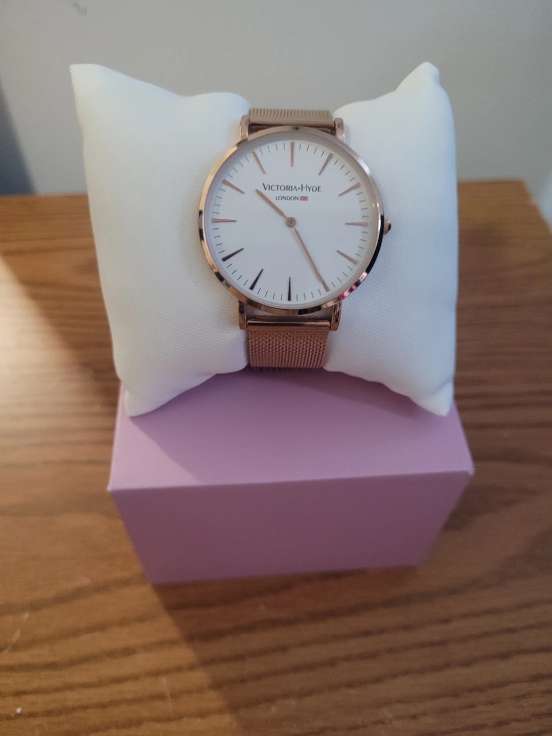 This is a rose gold watch from Victoria Hyde London. It features a white face with rose gold hour markers and a mesh band. Includes the original pink box.