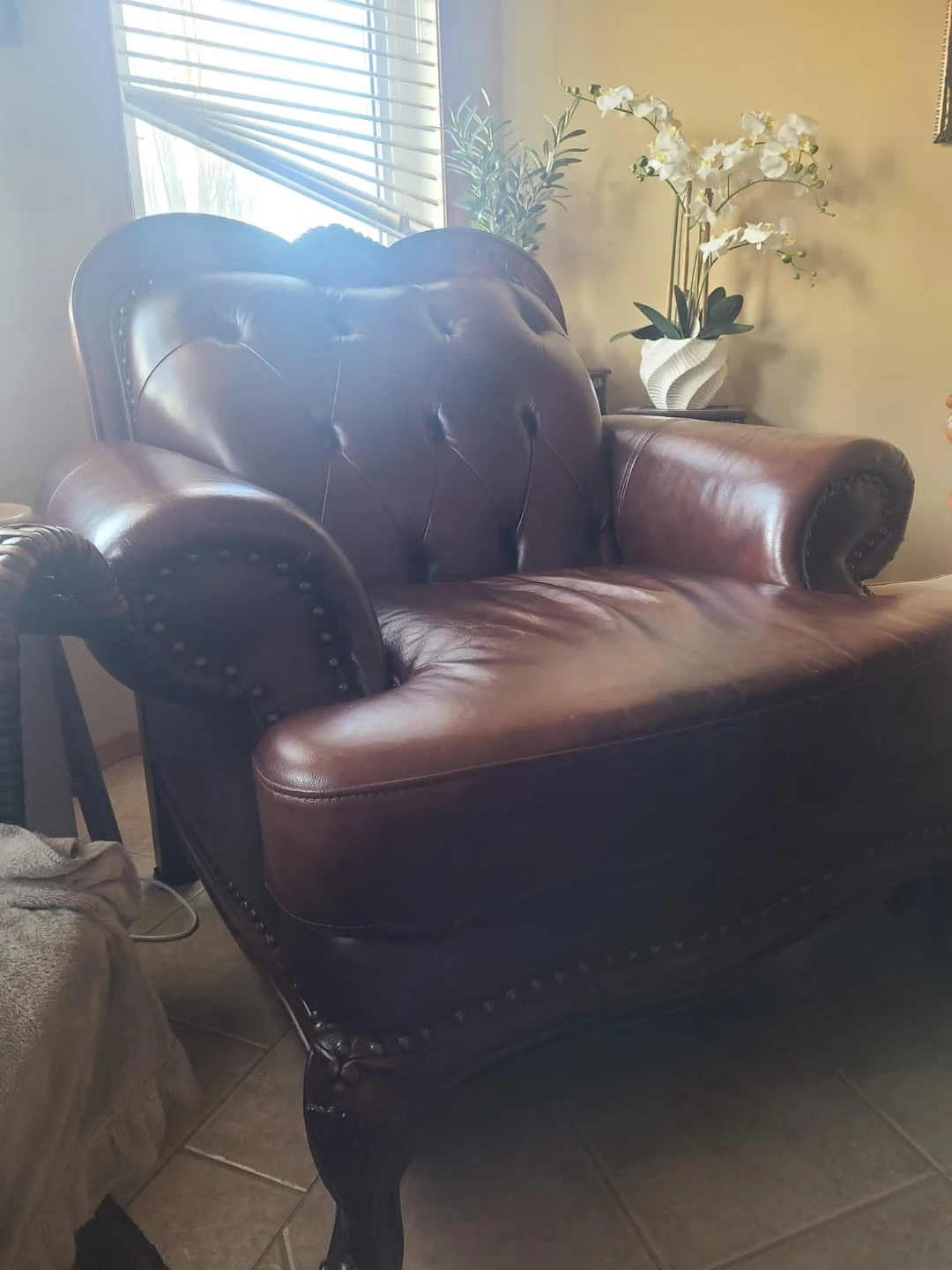 This is a stylish brown tufted leather accent chair. It features ornate wooden details on the legs and back, with studded trim along the base and arms. Its classic design adds a touch of elegance to any room.