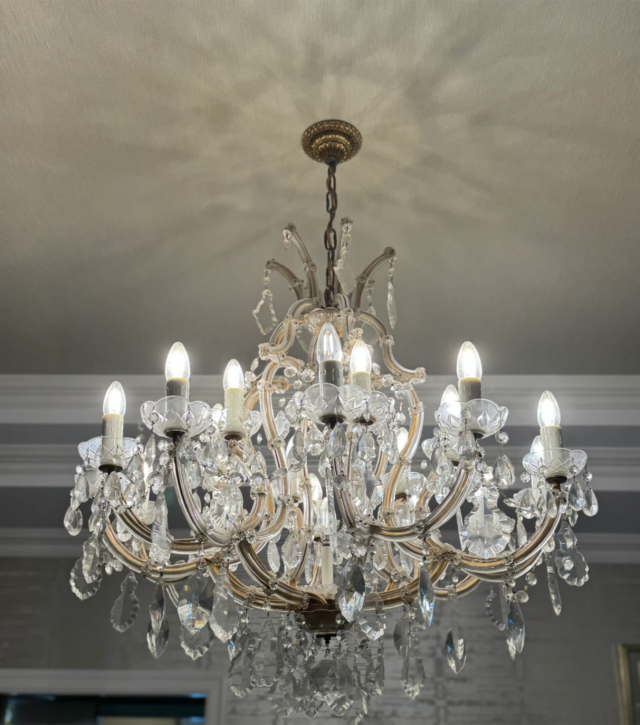 Selling a chandelier. It has a beautiful design with crystal accents. Perfect for adding a touch of elegance to any room! Missing a few crystals and need a good dusting.