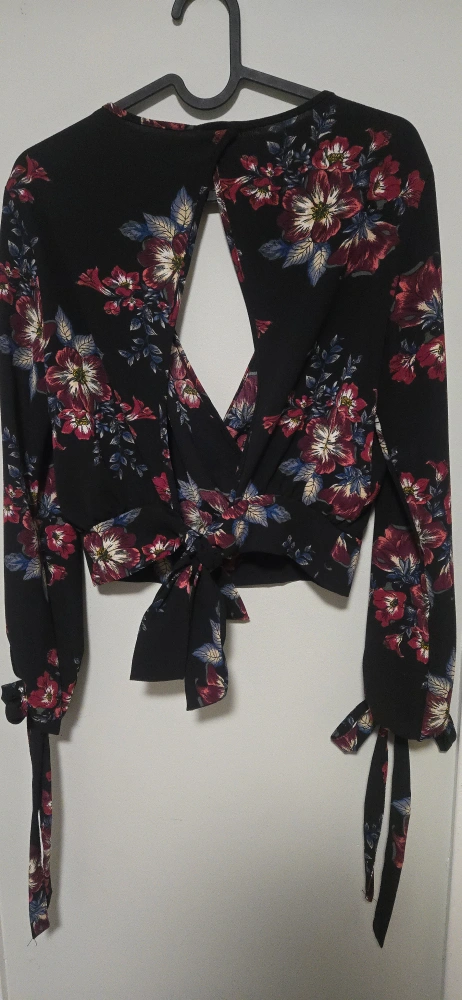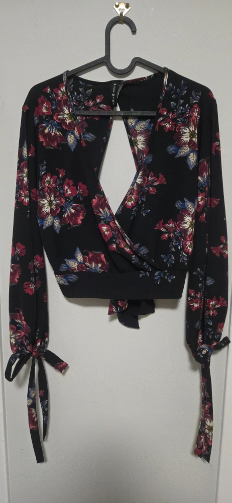 Black long-sleeved crop top. Features a wrap style and keyhole detail at the back. Floral print throughout. Fabric ties at the sleeves and back.