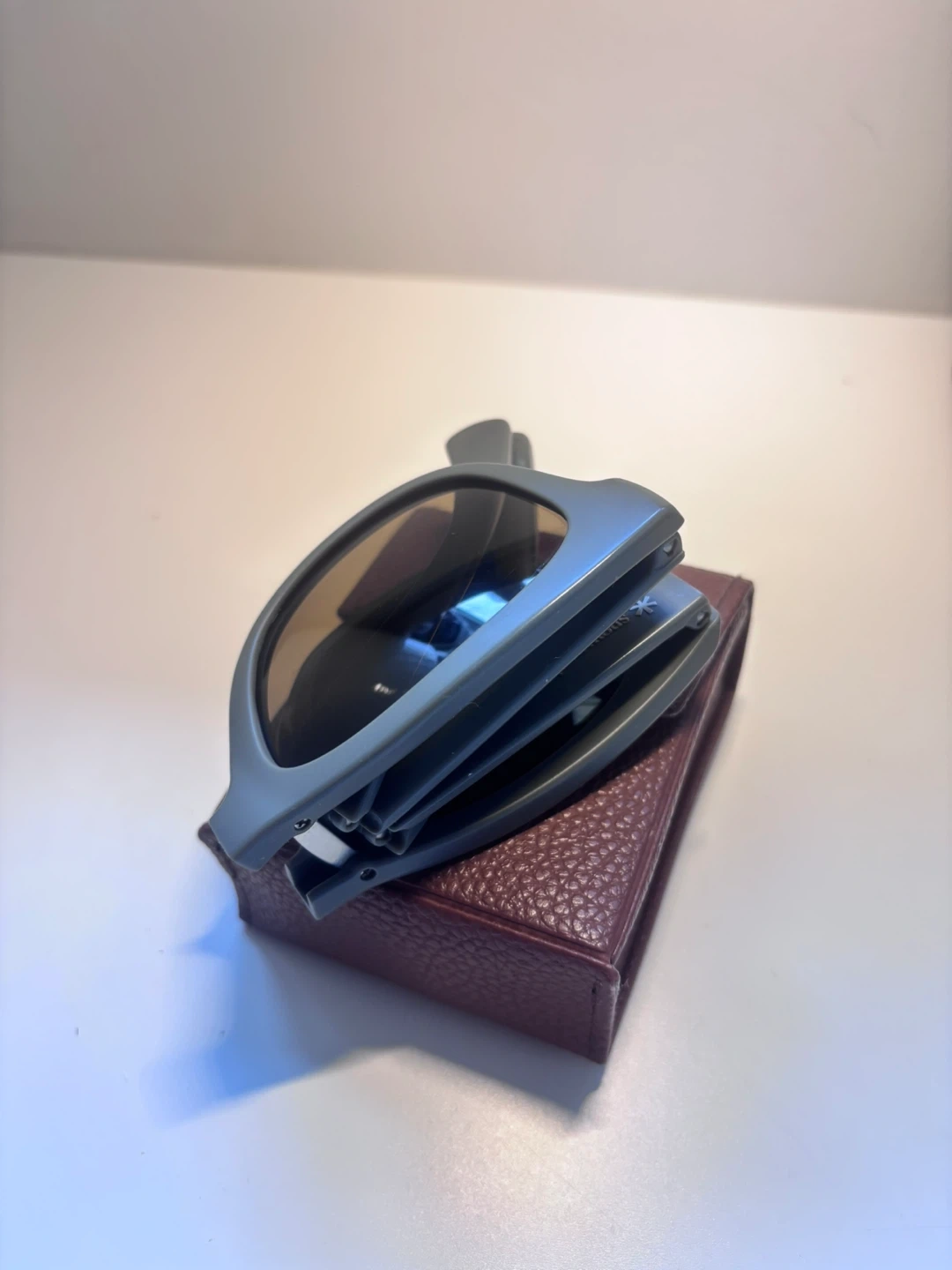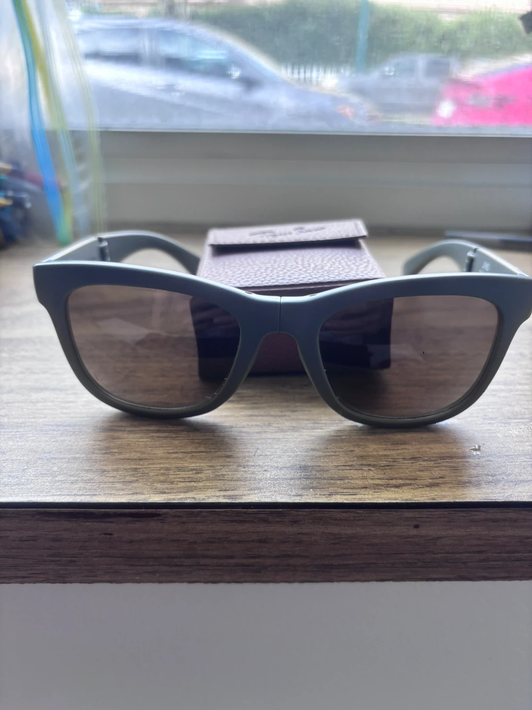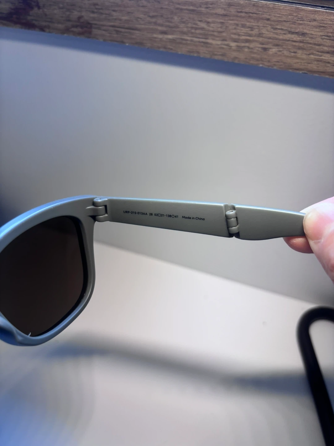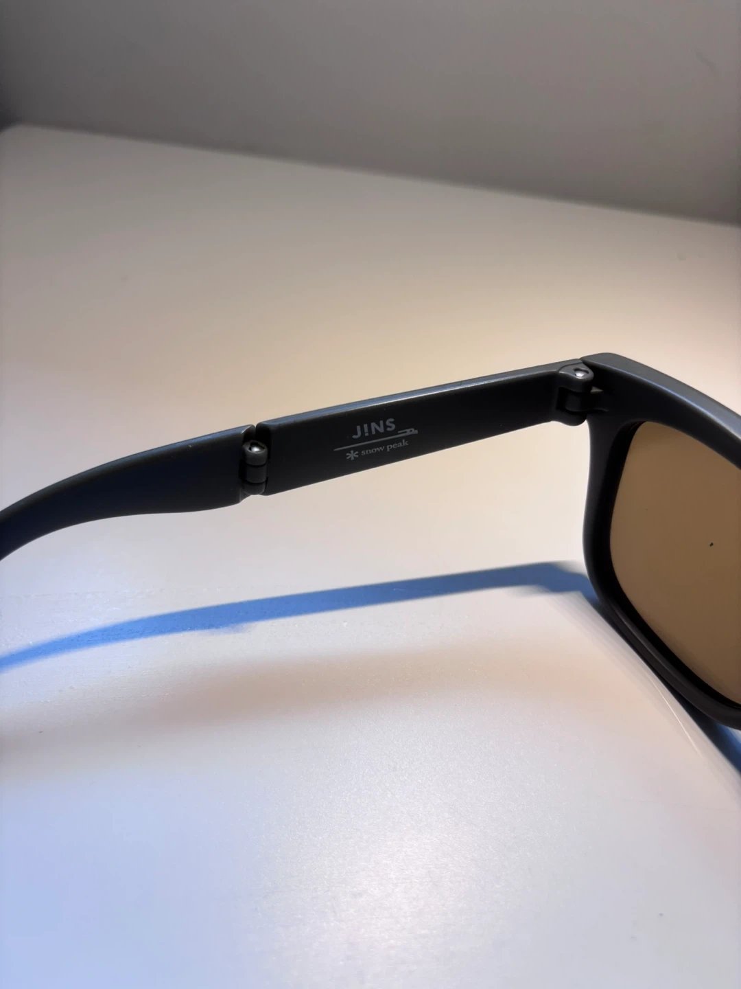 Stylish JINS x Snow Peak sunglasses. These are the URF-215-013AA model. Frame is a cool dark grey with brown lenses. Sizing is 52-21-138. Comes with a Rayban brown case.