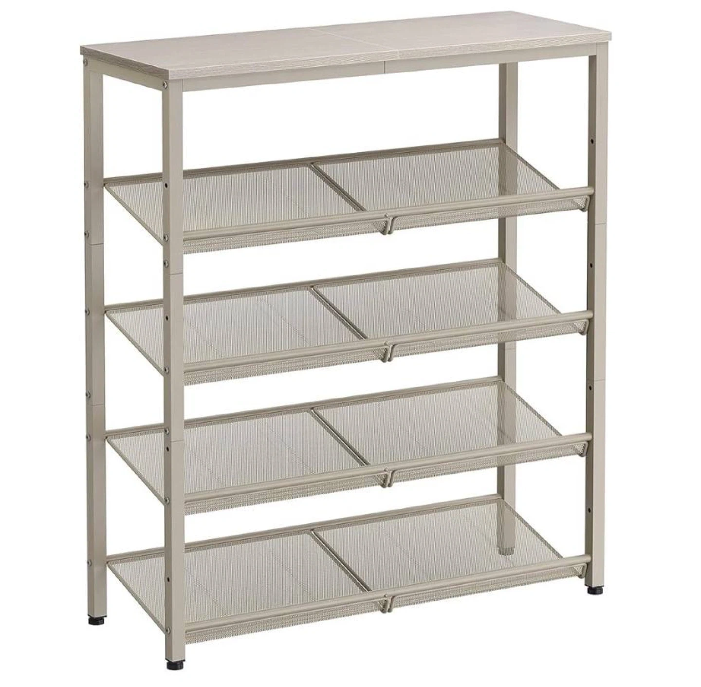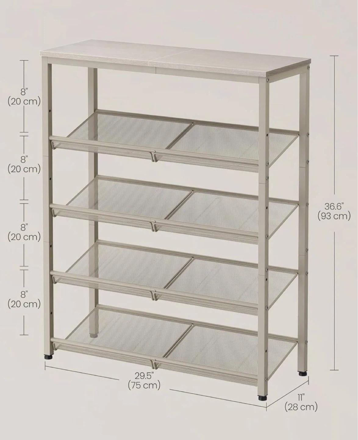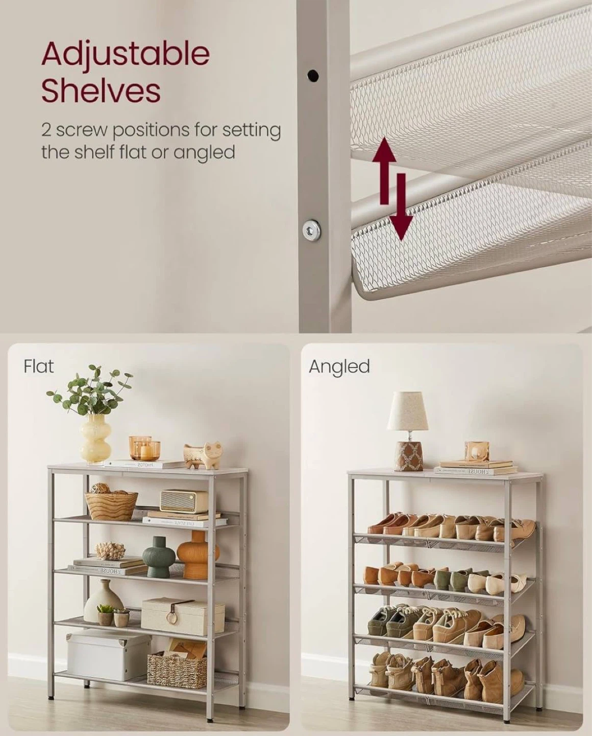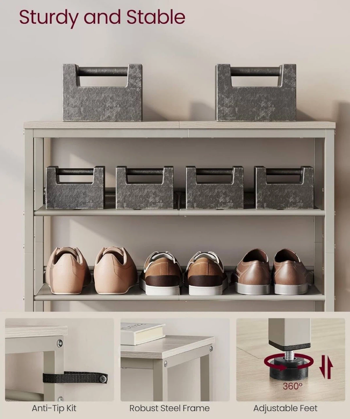 Designed in a stylish industrial look with neutral cappuccino and oatmeal beige tones that fit easily into any home decor. Shelves are adjustable to accommodate different types of shoes, from sneakers to boots.
