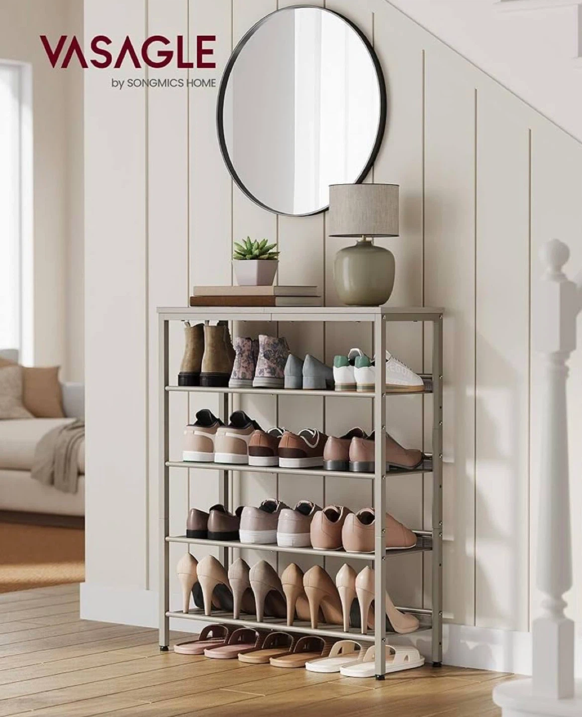 Modern and functional shoe rack from VASAGLE, perfect for keeping your entryway, hallway, or closet clean and organized. Features 5 spacious tiers plus a wide top surface for bags, decor, or everyday essentials.