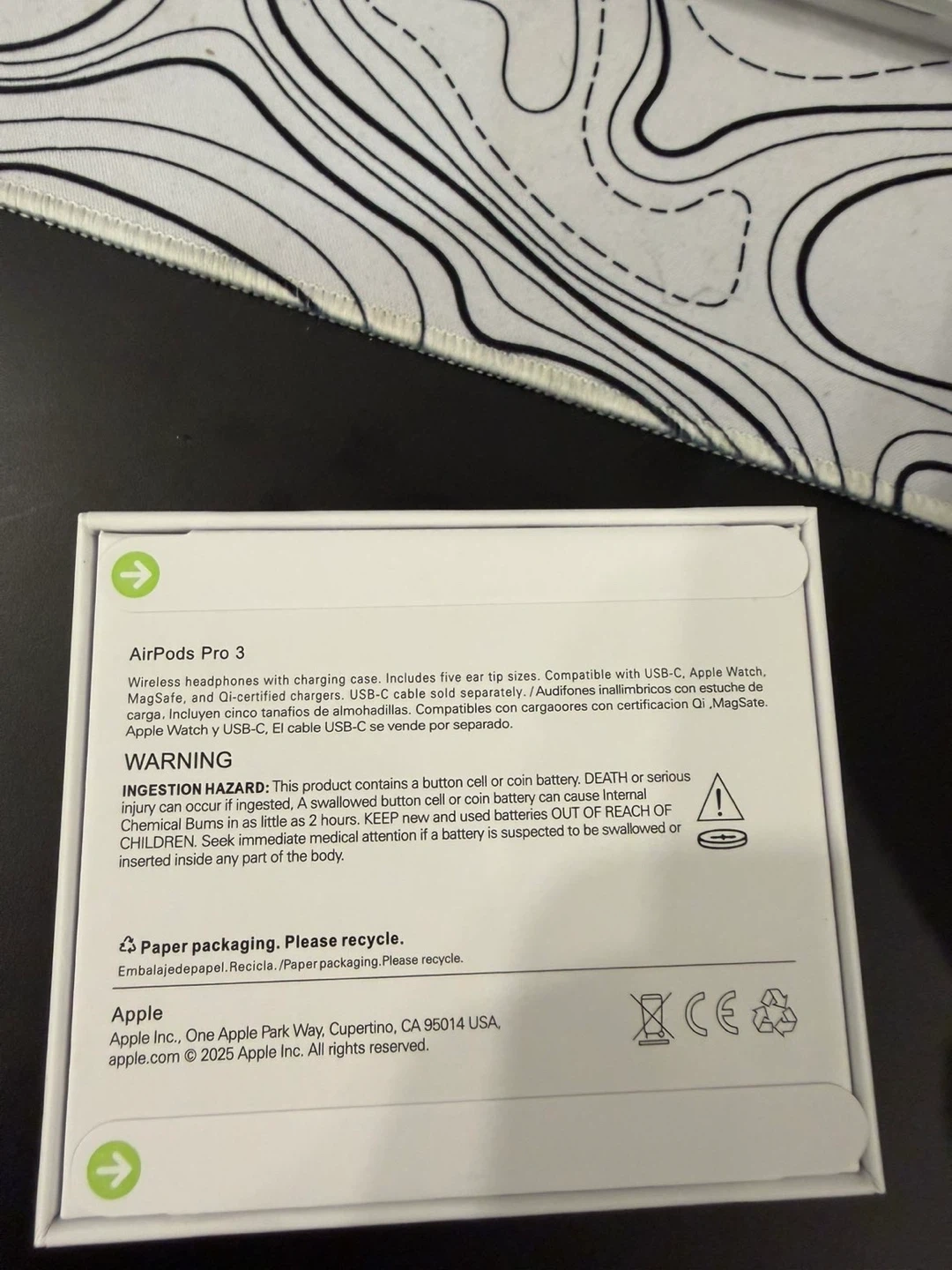 Wireless headphones with charging case. Includes five ear tip sizes. Compatible with USB-C, Apple Watch, MagSafe, and Qi-certified chargers. Comes with a USB-C cable. Paper packaging, please recycle.