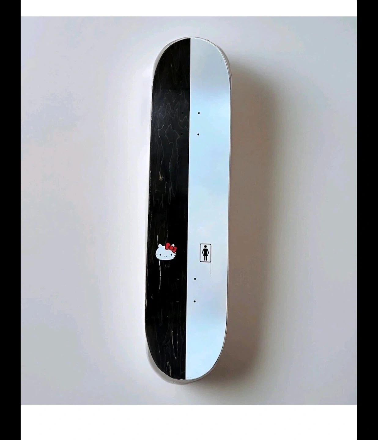 This is a Girl Skateboards x Hello Kitty collaboration deck. It features a split black and white design with Hello Kitty branding on one side and a red graphic print on the other. Perfect for collectors or skaters looking for a unique setup! 45th limited edition deck!
