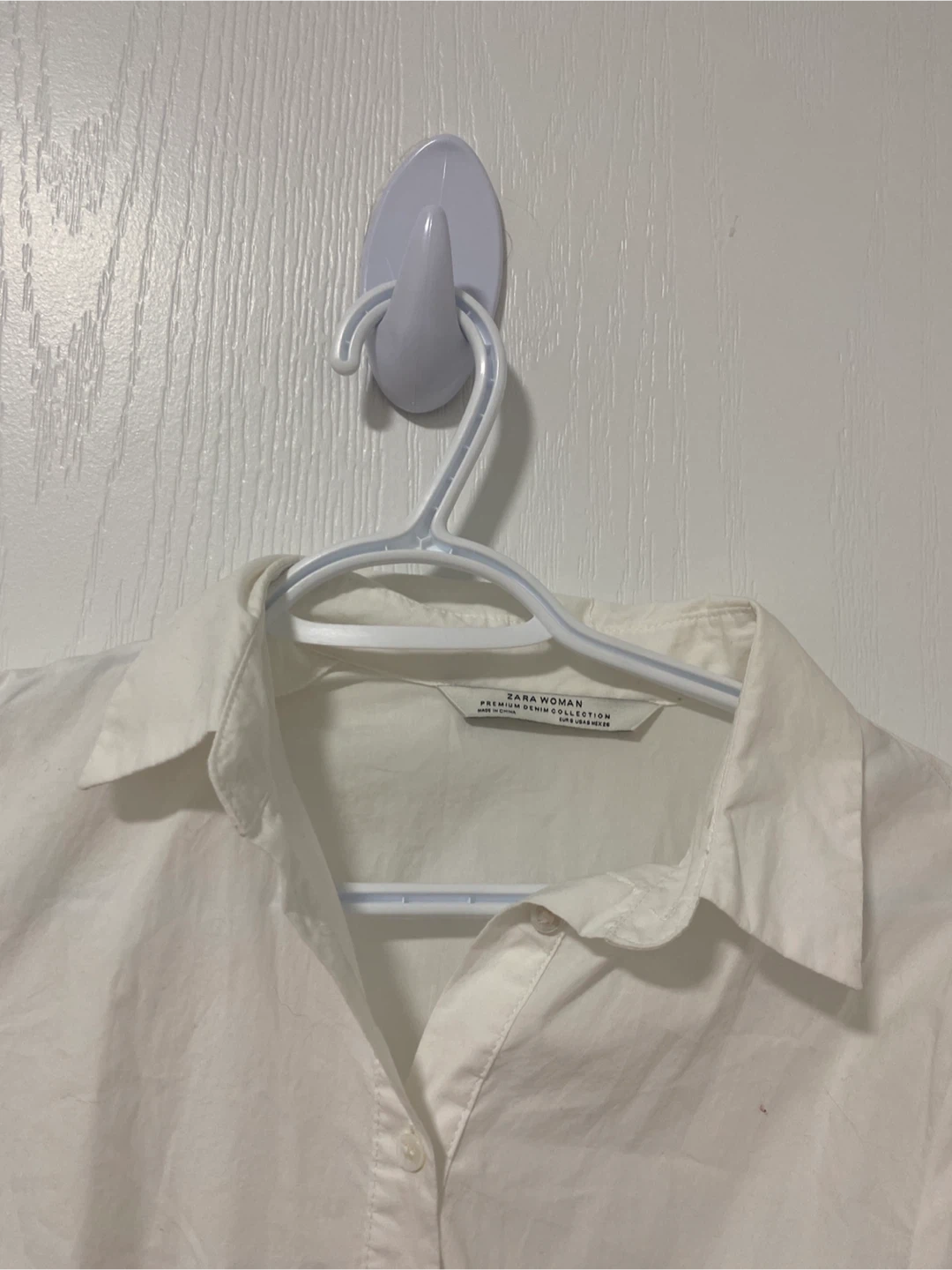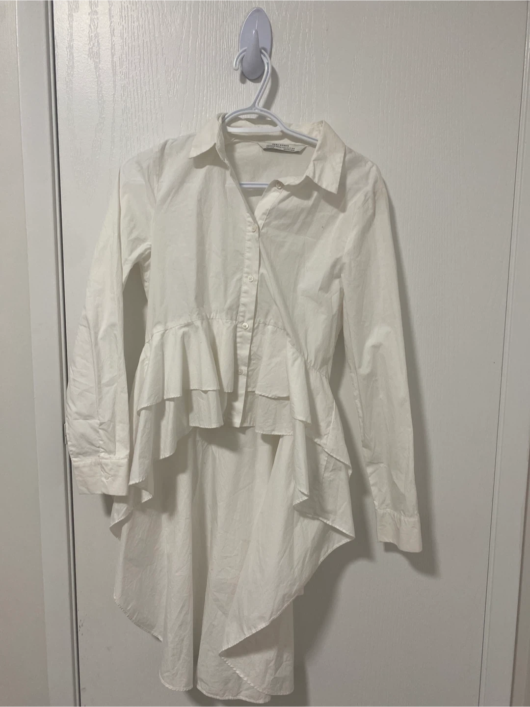A stylish white peplum blouse from Zara Woman. It's a long-sleeved button-up with a unique tiered ruffle detail. Cotton blend material. Pick up cash only