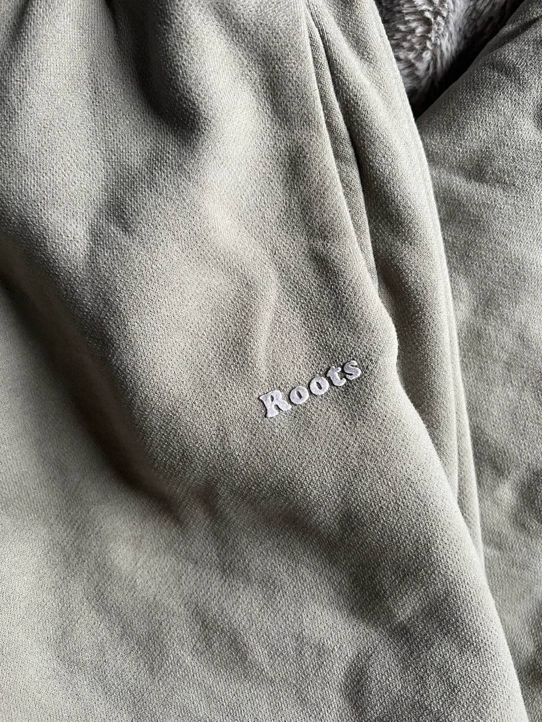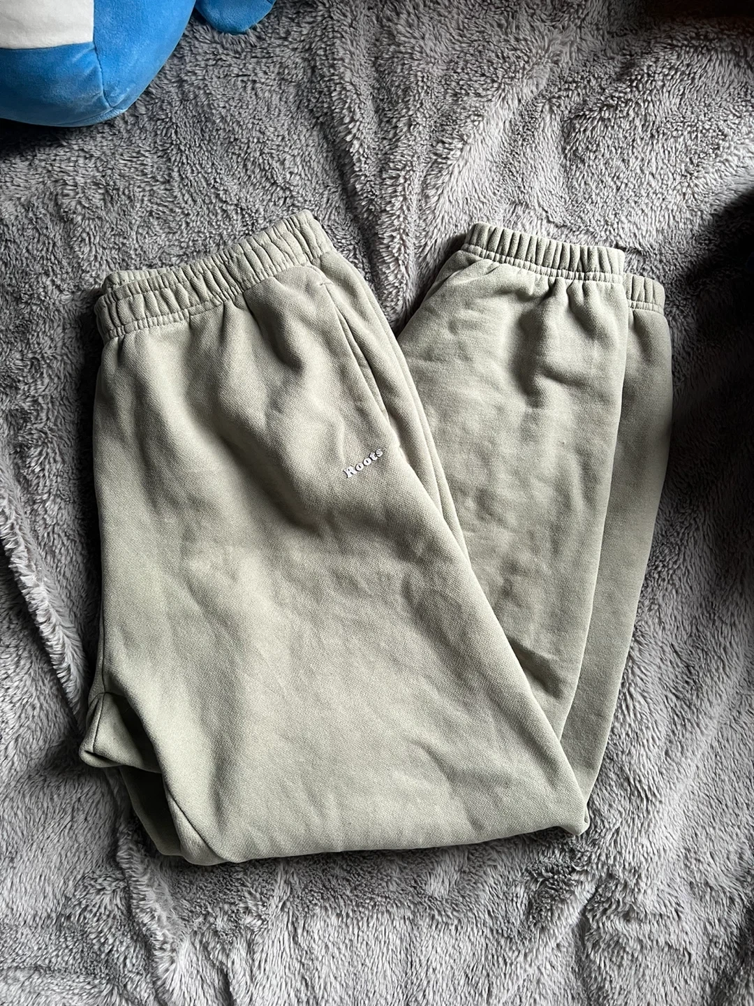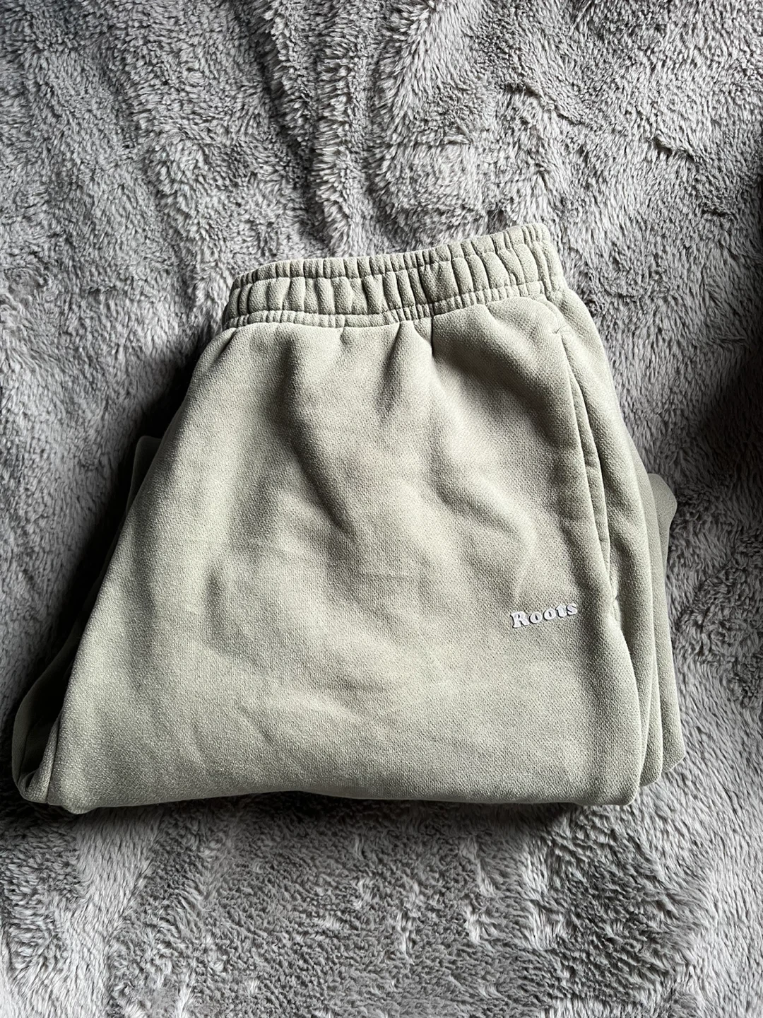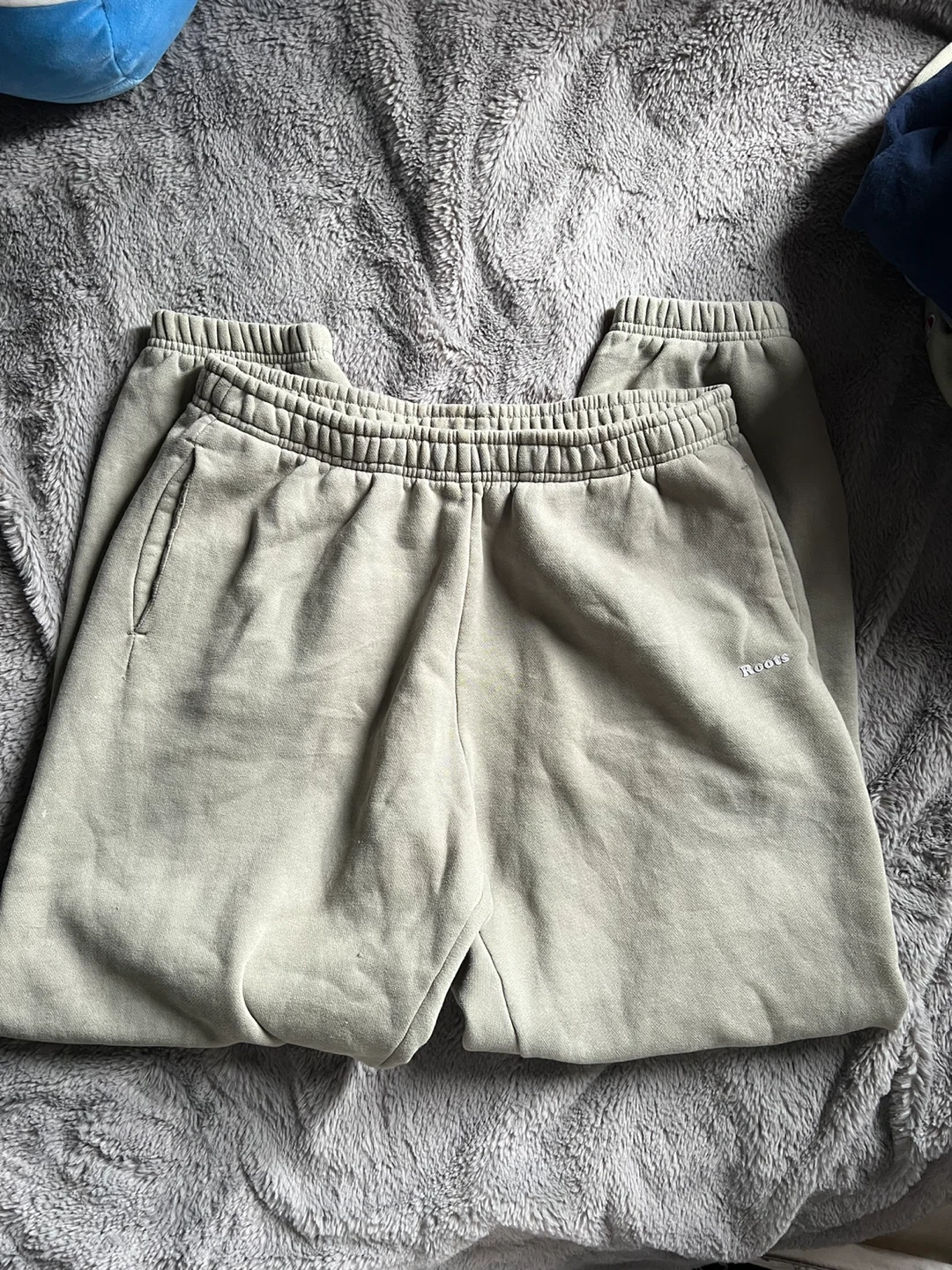 Khaki green roots sweatpants. Size medium (men’s I think) Elastic waistband with but this style of sweat didn’t come with drawstring