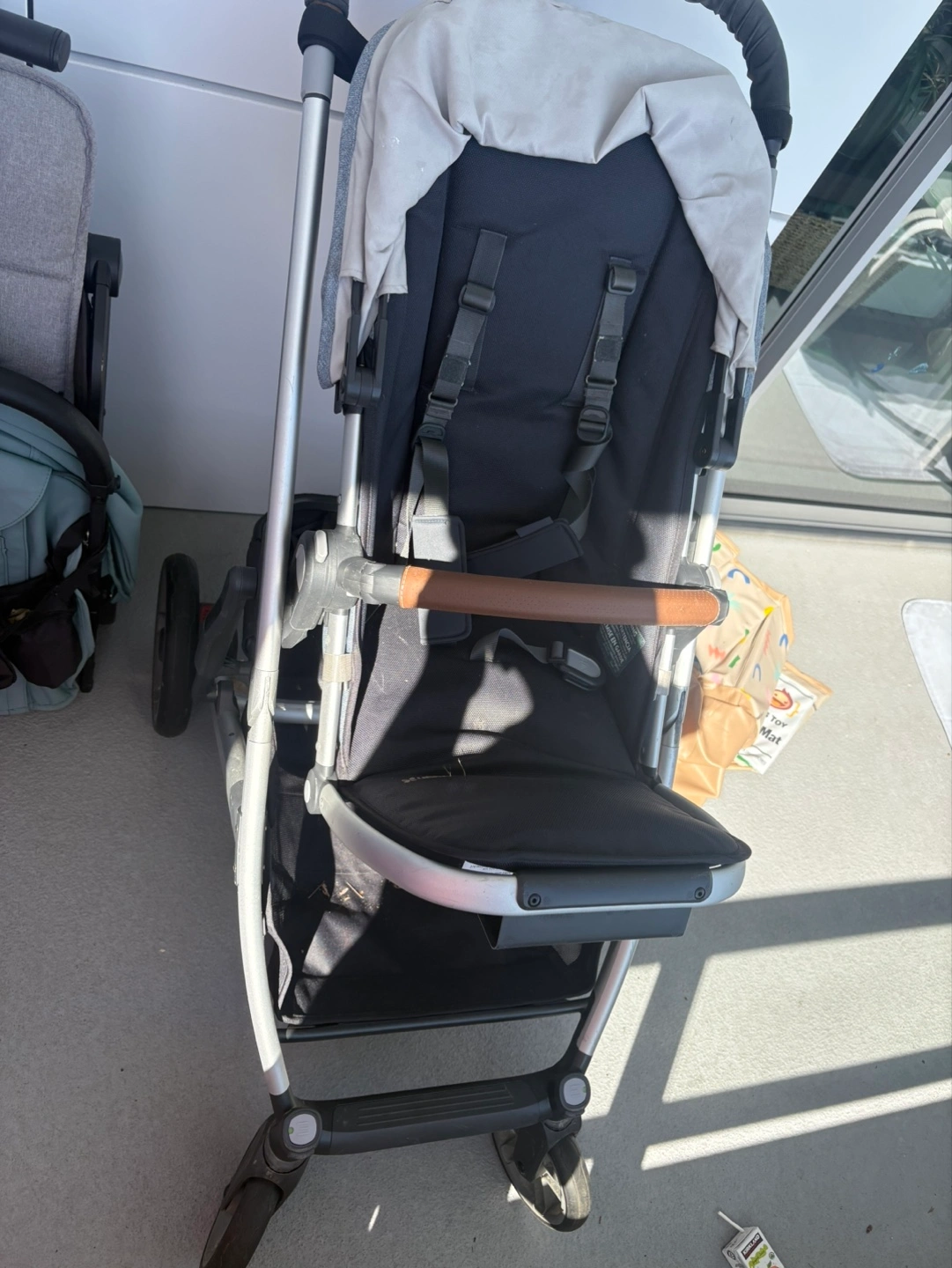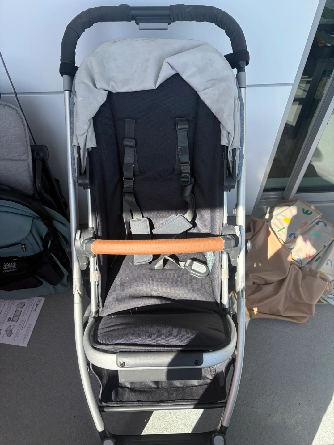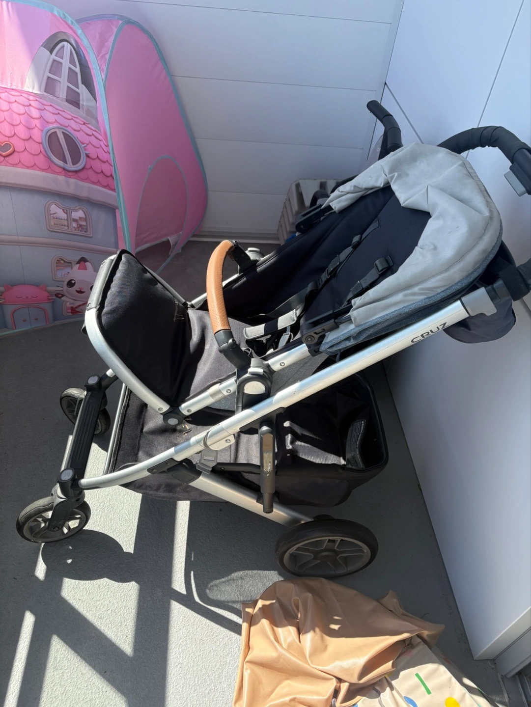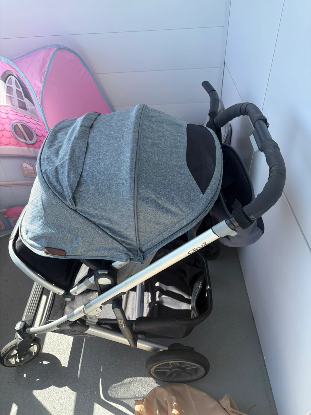 Used Cruz twin stroller. Grey and black fabric. Features include a large storage basket underneath. Suitable for two children. Some wear and tear.