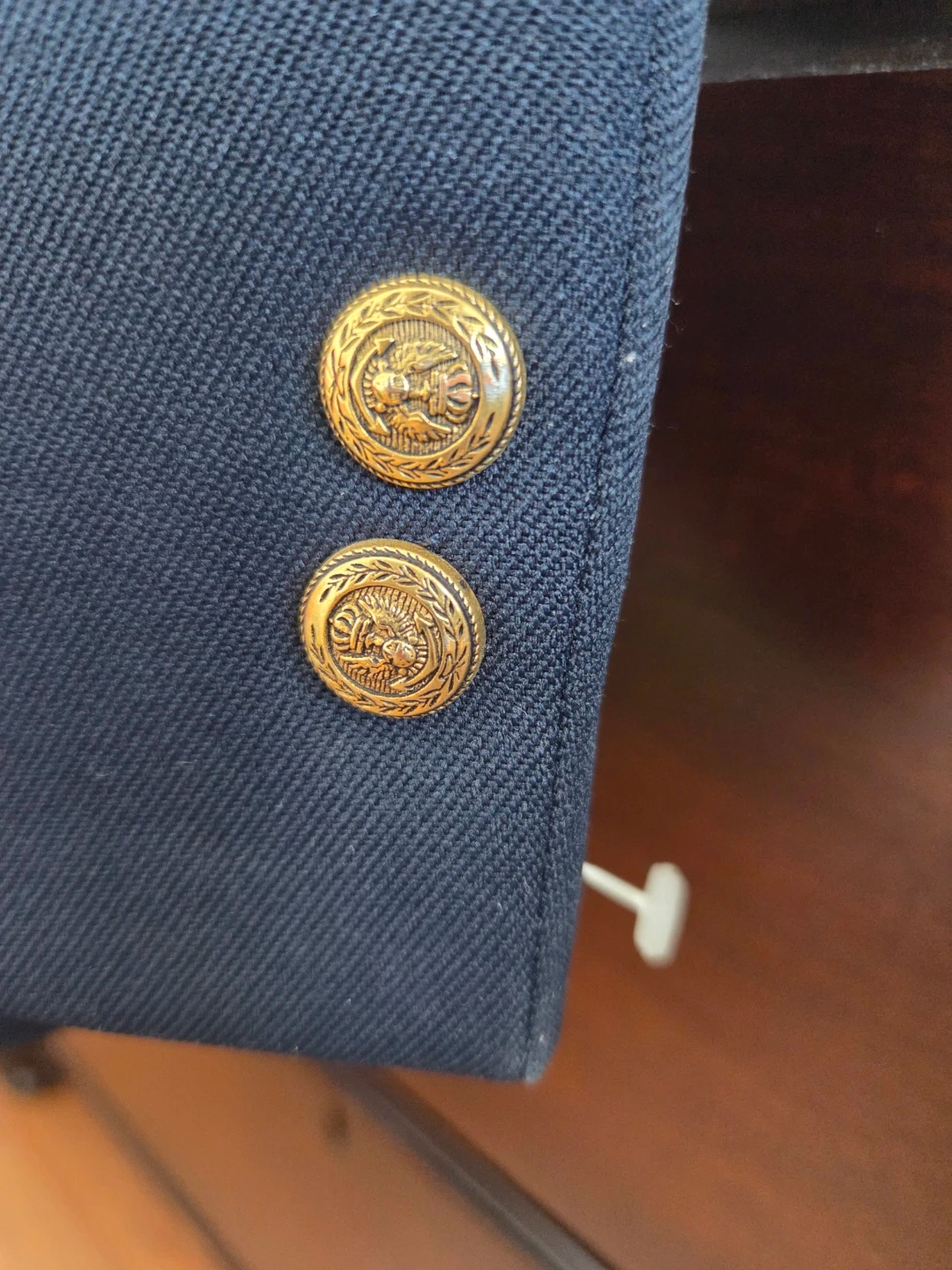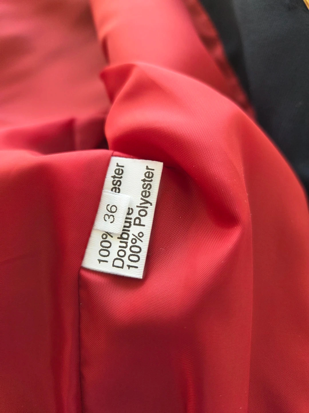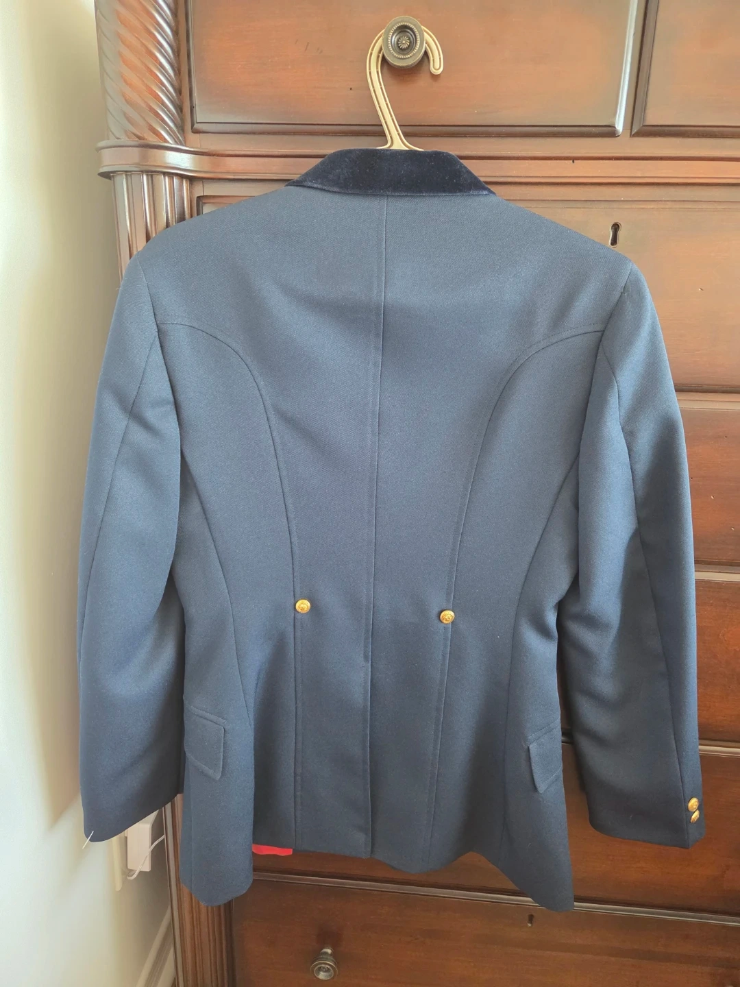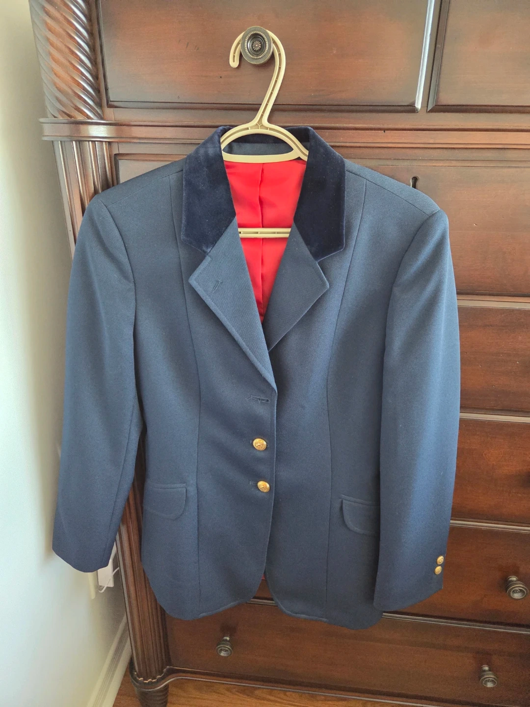 Classic navy blue equestrian riding jacket. Features a velvet collar and striking red satin lining. Gold buttons with embossed design. Great for shows, professional events at work or schooling!