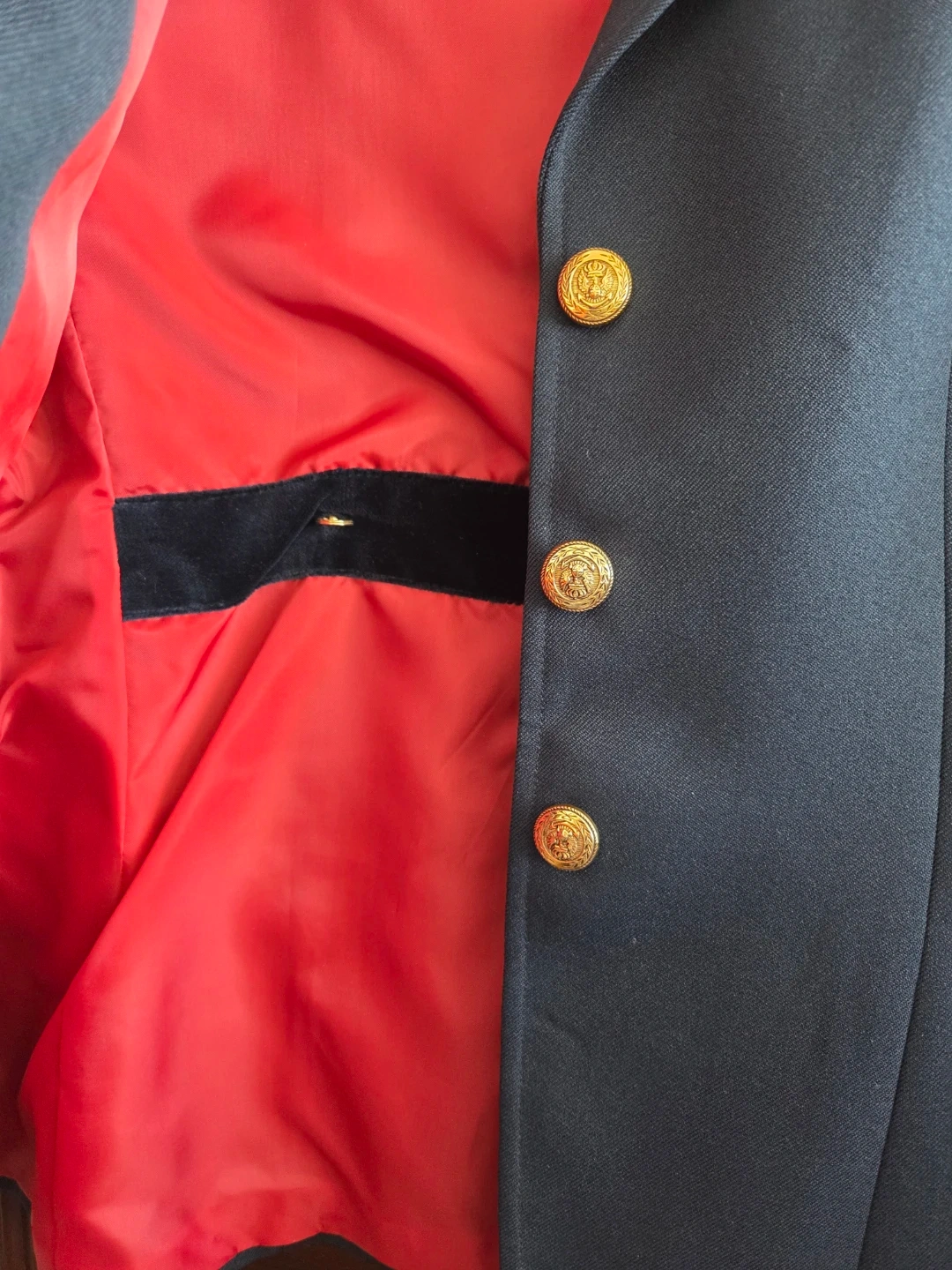 Classic navy blue equestrian riding jacket. Features a velvet collar and striking red satin lining. Gold buttons with embossed design. Great for shows, professional events at work or schooling!