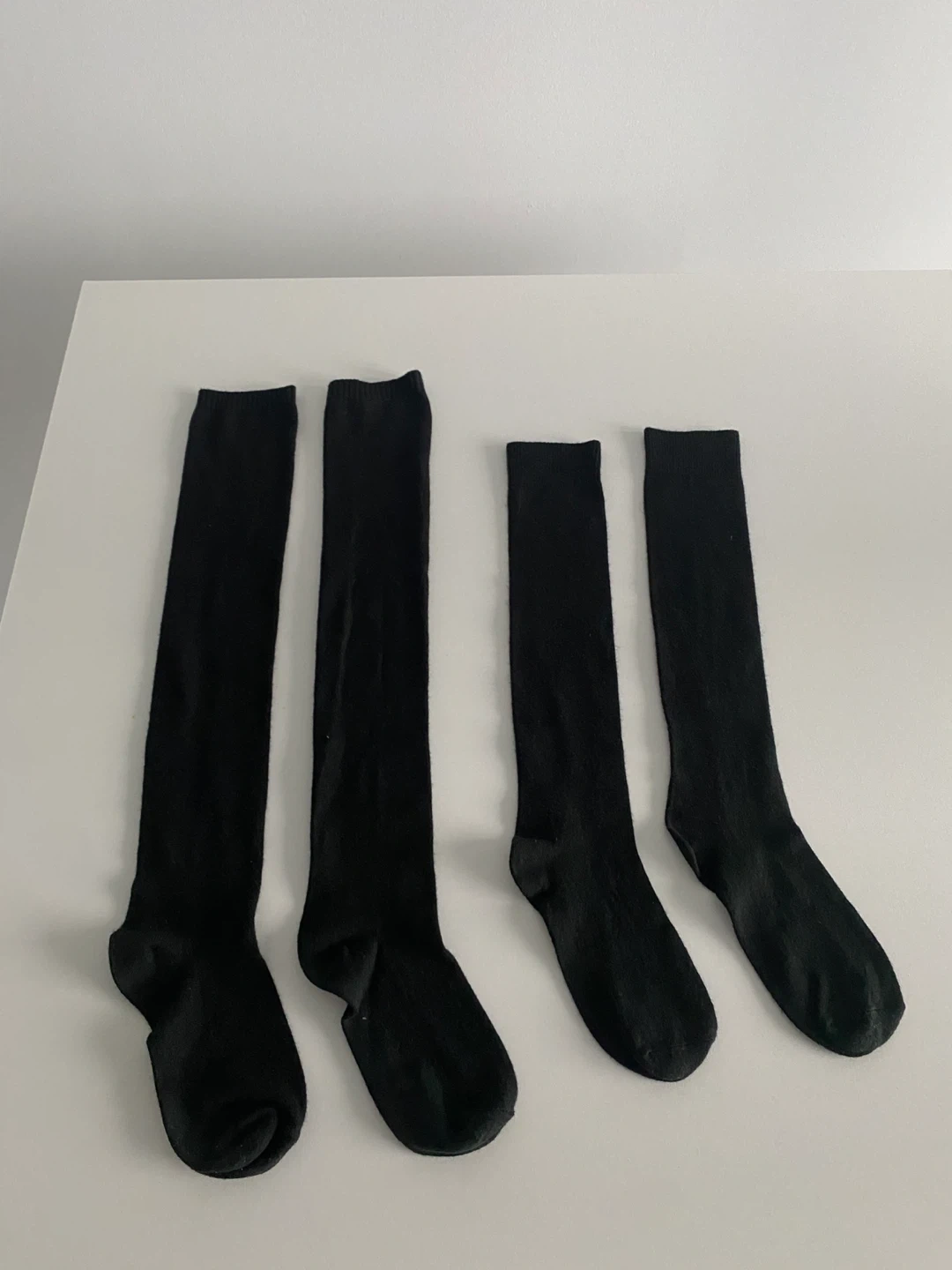 Selling a set of two long socks in black colour. One is knee length and other pair is thigh high length. Material is very soft. Never worn condition.