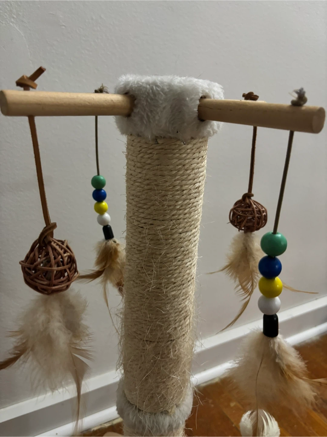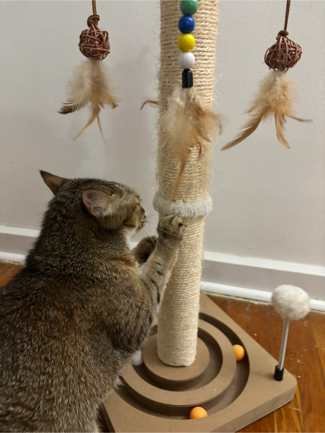 This cat scratching post features a durable sisal rope wrapped column for scratching and a top perch with dangling toys. It also has a fun maze on the base with balls to keep your feline friend entertained. Great for cats to climb, scratch, and play!