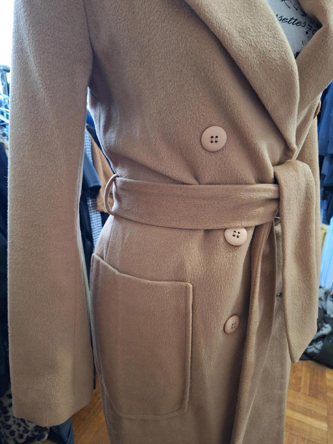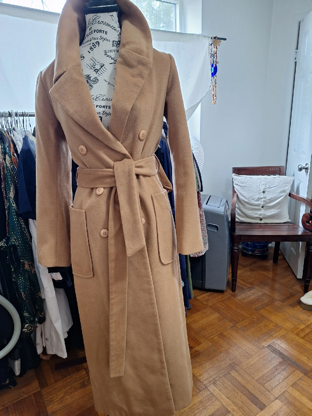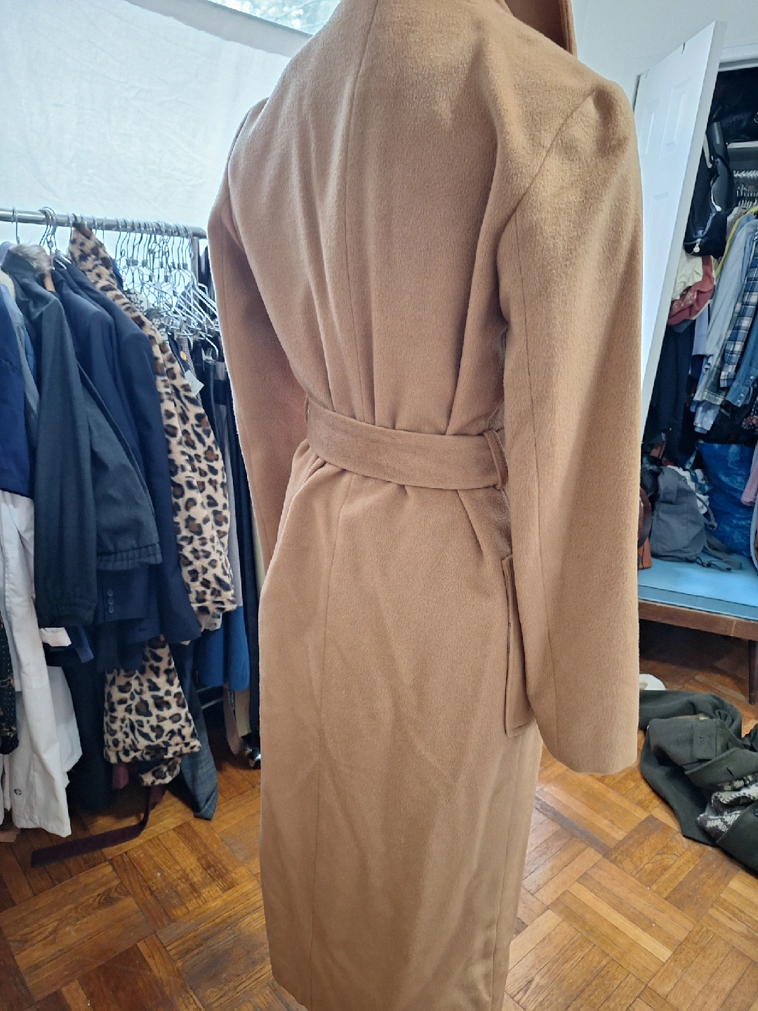 Selling a JLOUN coat in size small. It's a beautiful, long, belted coat in a tan colour. Perfect for fall or winter! wool blend and fully lined. square outter pockets. like new hardly worn.