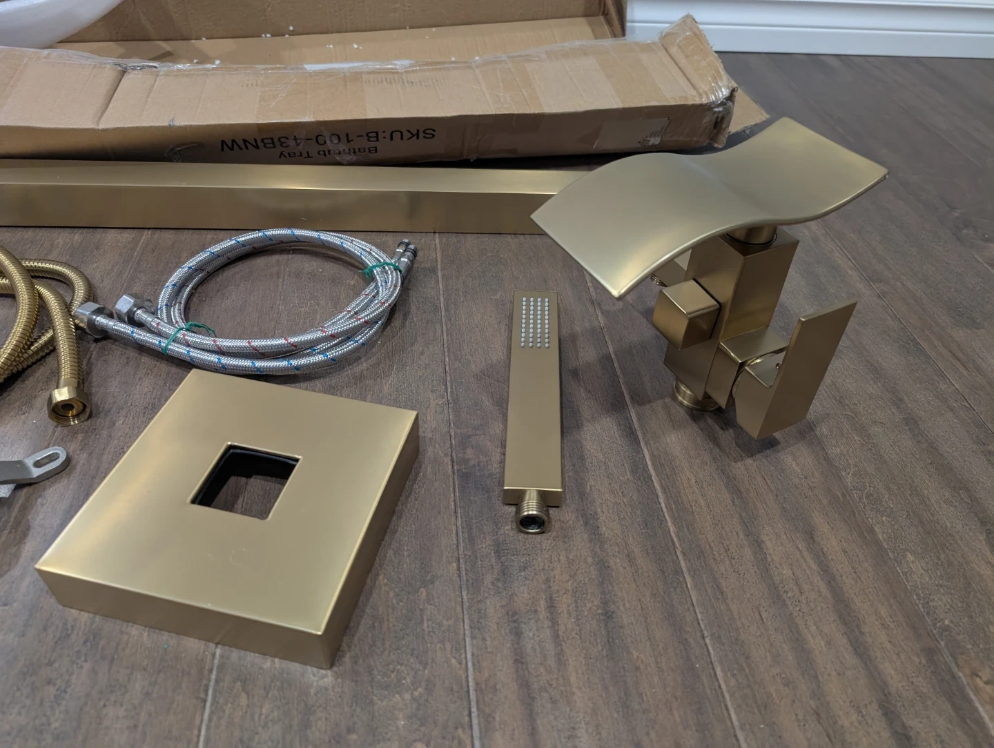 Brand new gold freestanding tub filler waterfall faucet for sale. Stainless steel brass, valve, wand hand shower, mounting hardware, spout swivel, $80 FIRM.