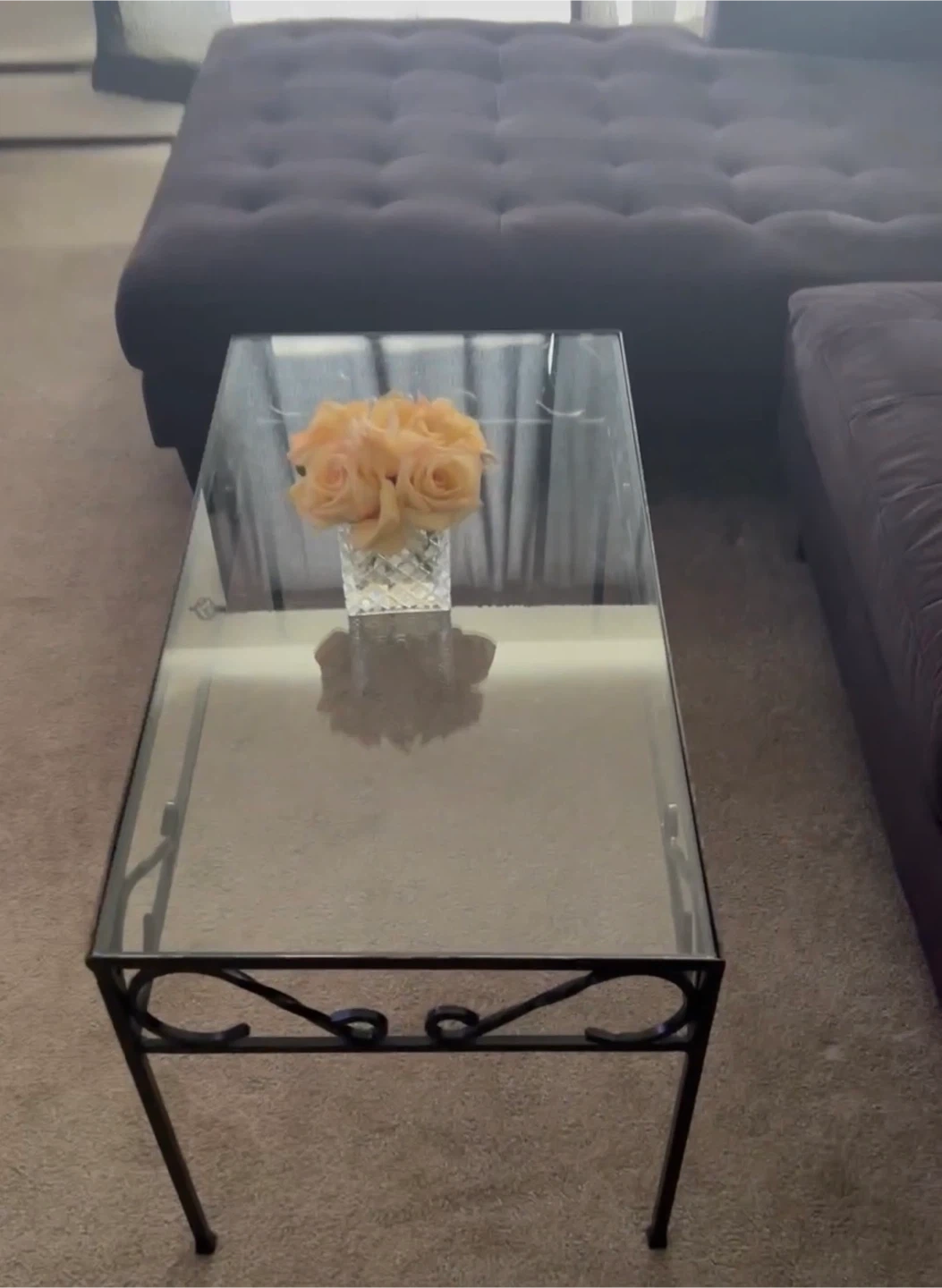 Rectangular coffee table featuring a clear glass top and a black metal frame with decorative scroll details. Its compact size makes it suitable for smaller living spaces.