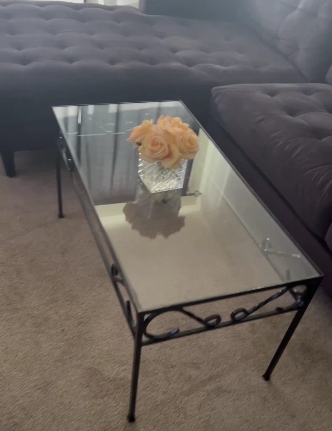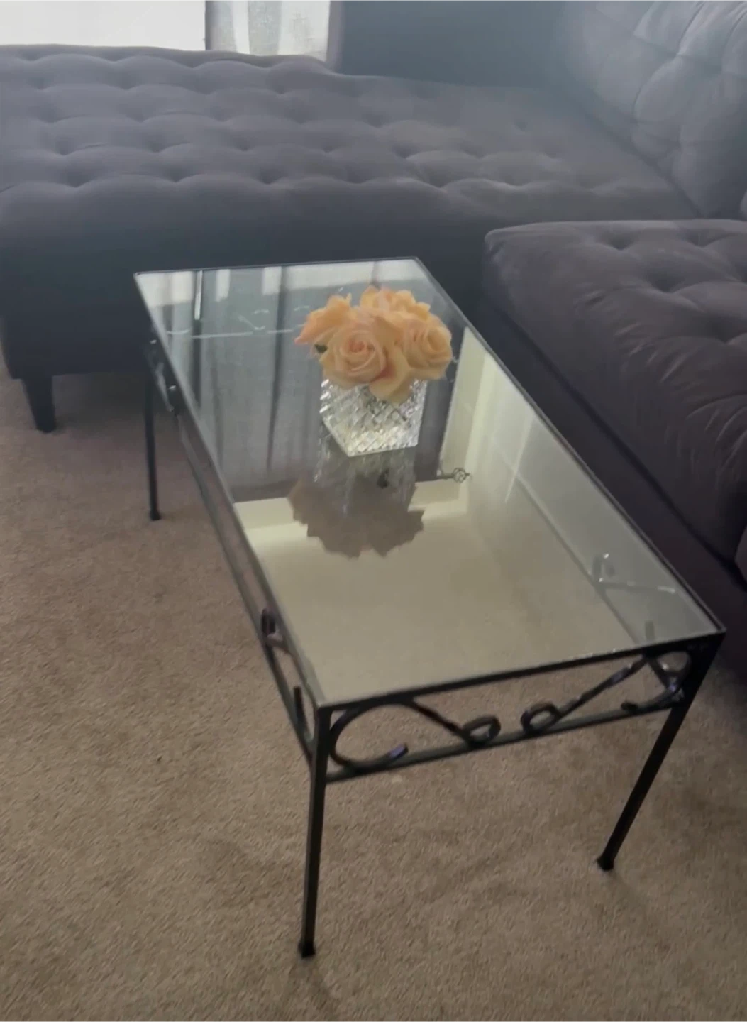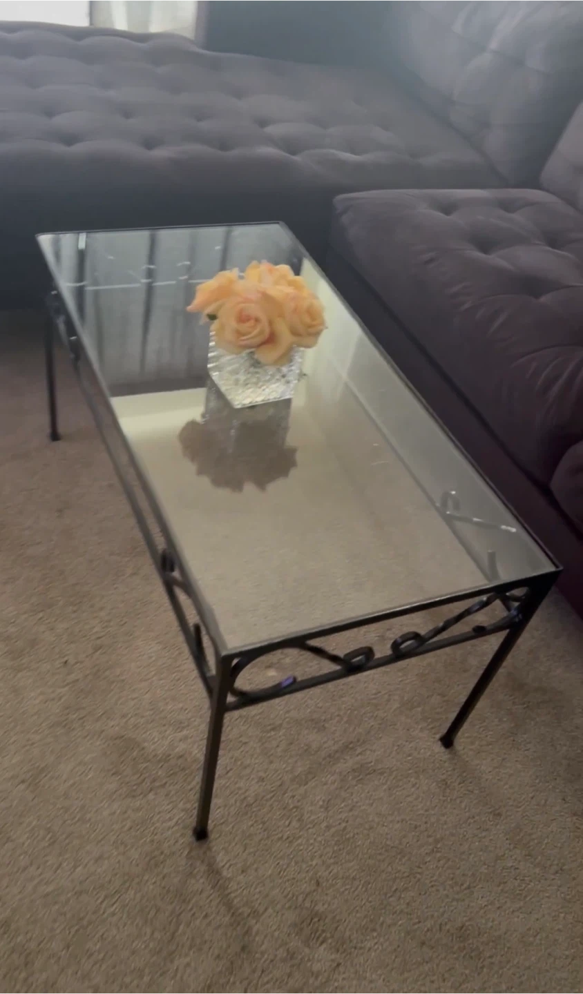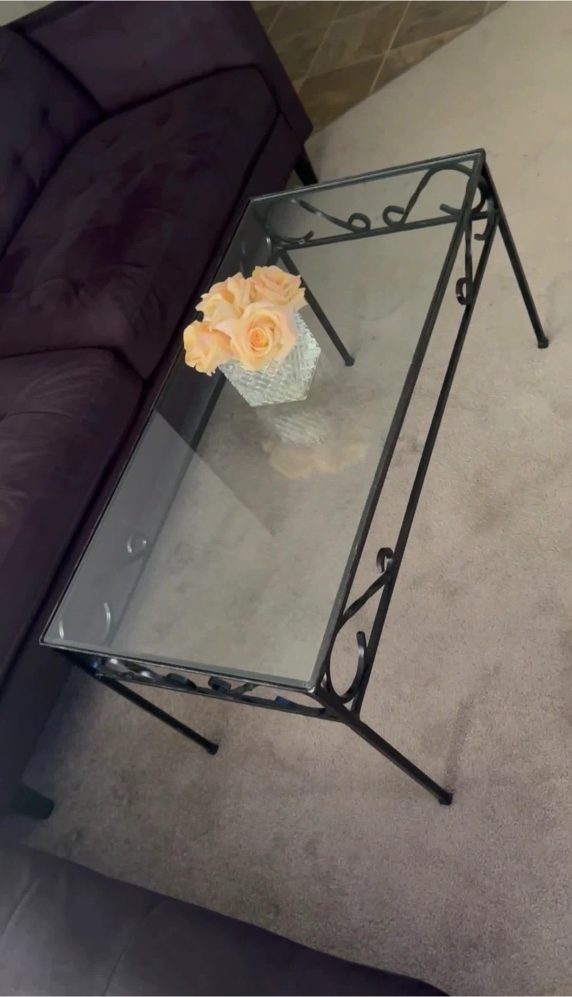 Rectangular coffee table featuring a clear glass top and a black metal frame with decorative scroll details. Its compact size makes it suitable for smaller living spaces.
