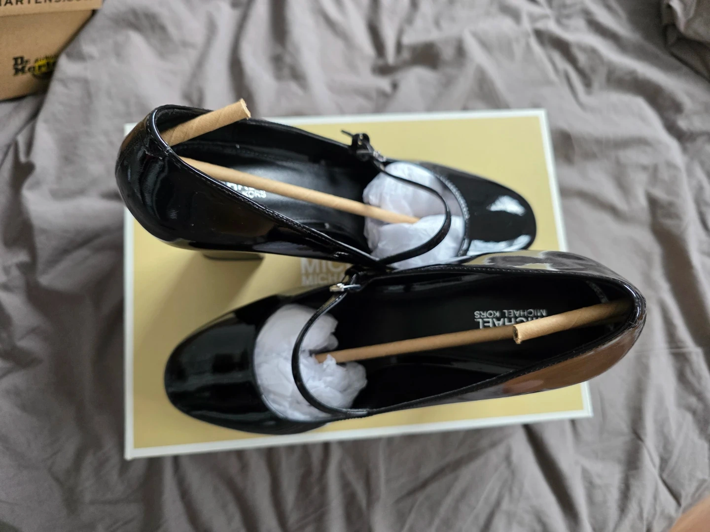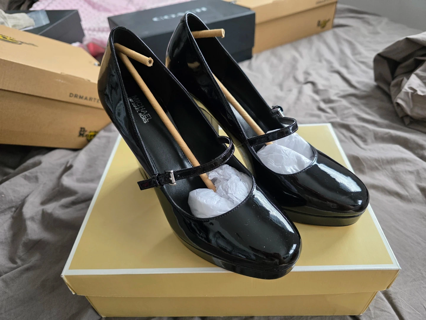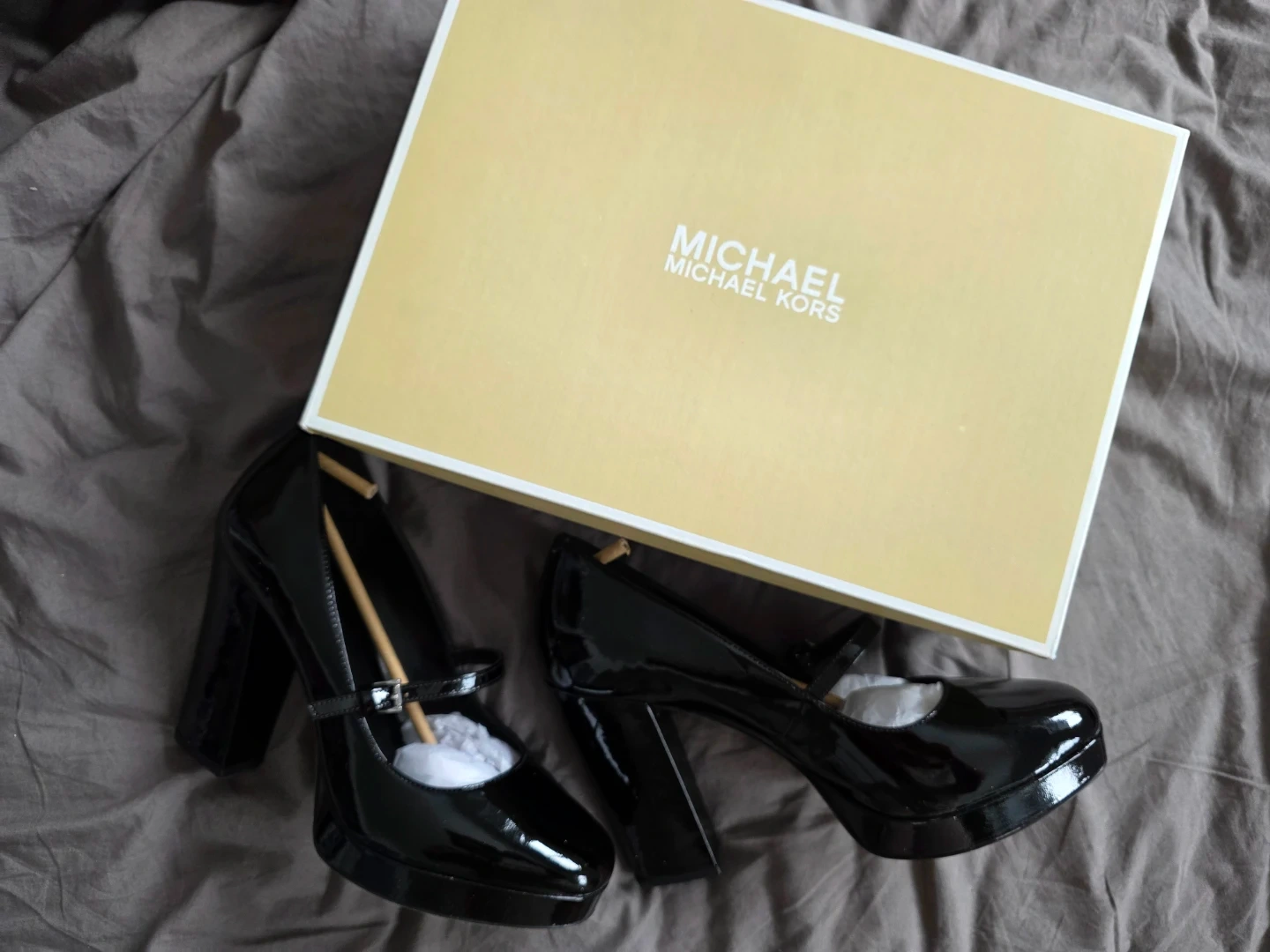 Shiny black patent leather Mary Jane style heels. They feature a platform sole and a buckle strap closure. Comes with original Michael Kors box. Used only to walk around the house but it's not really for me.