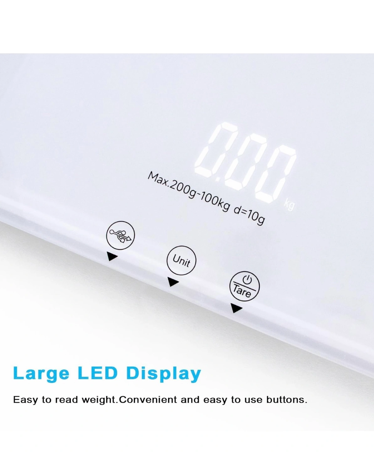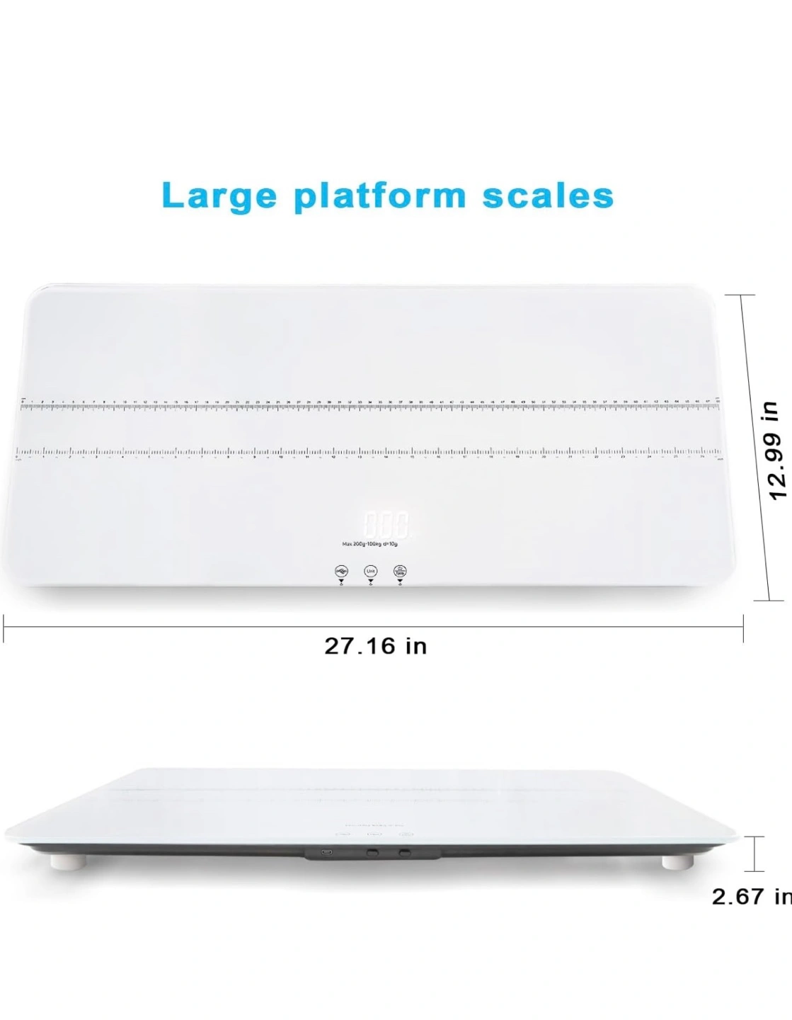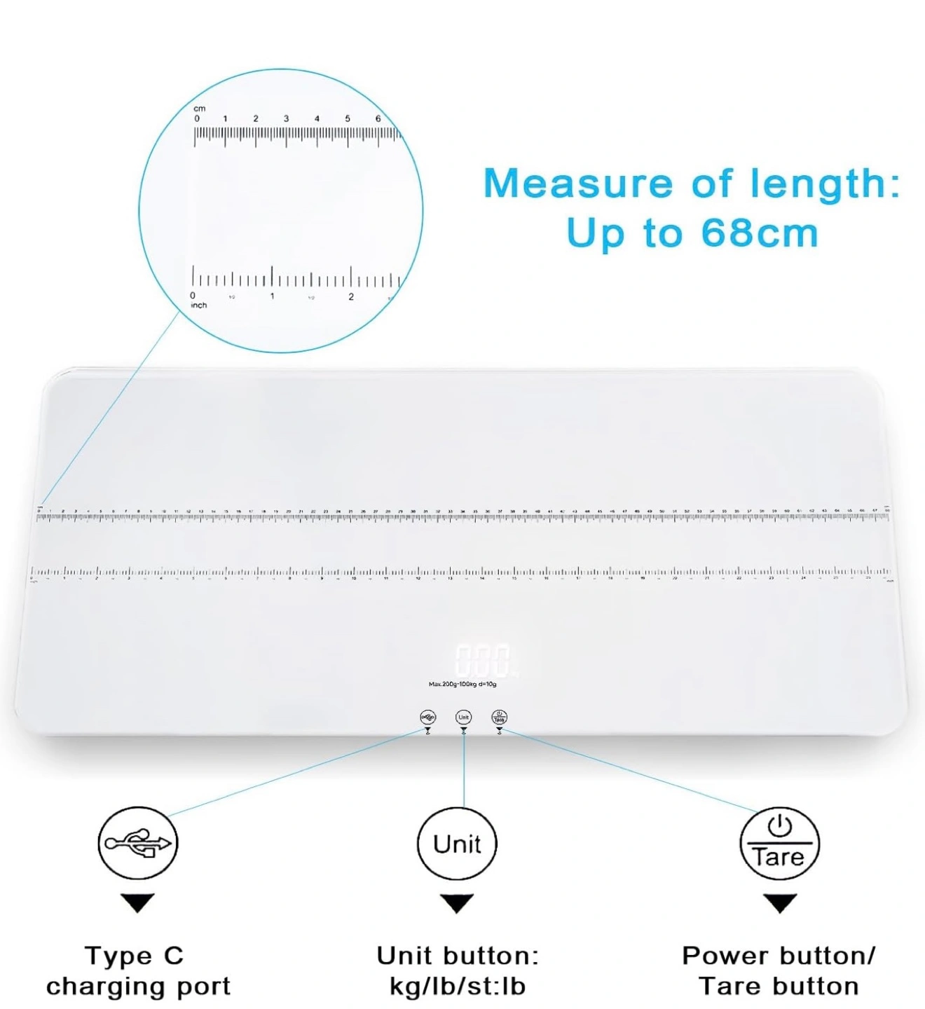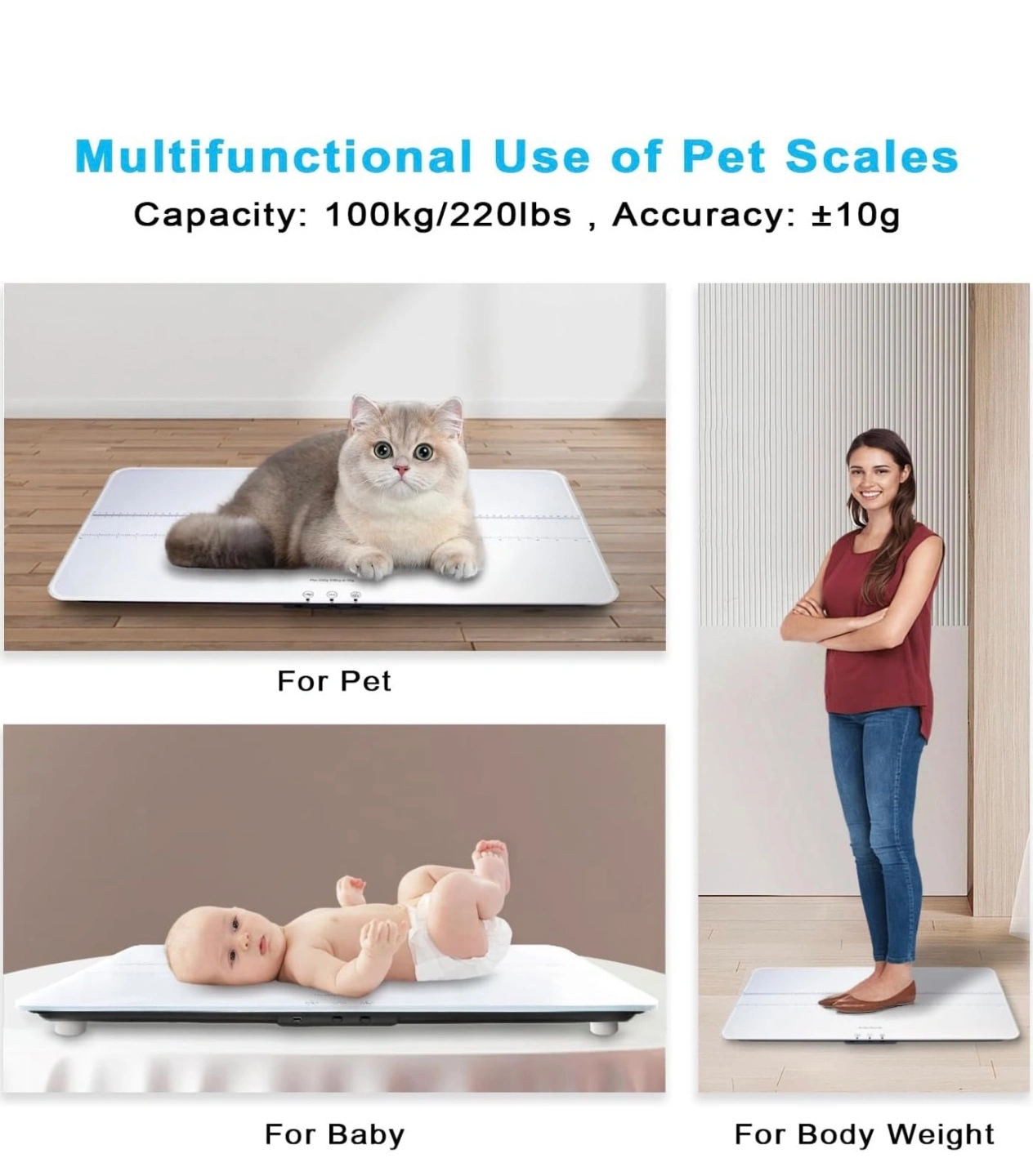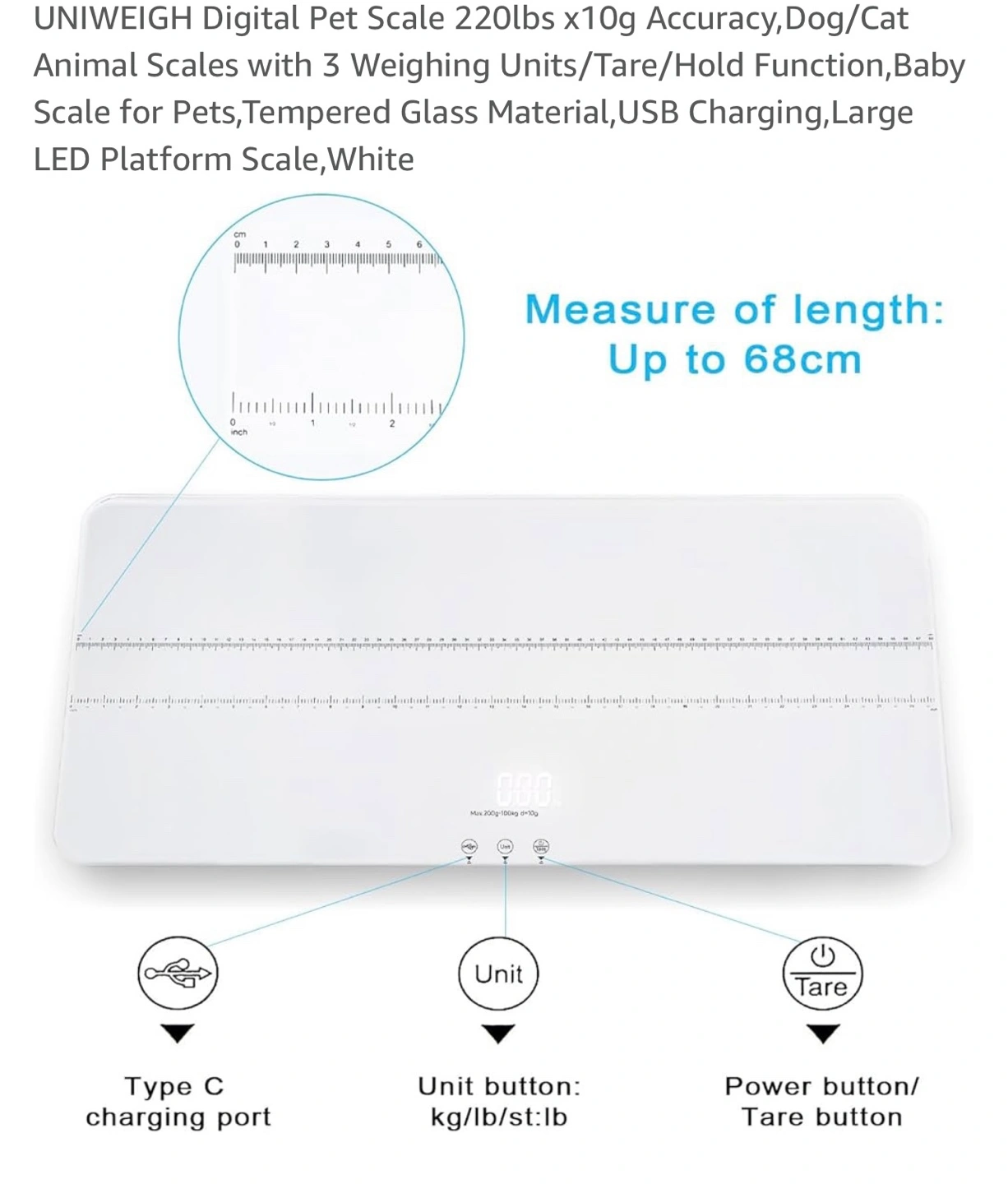 Large platform pet scale. Measures up to 220 lbs/100kg. Features tempered glass, USB charging, and tare function. Measures in kg/lb/st:lb. White.