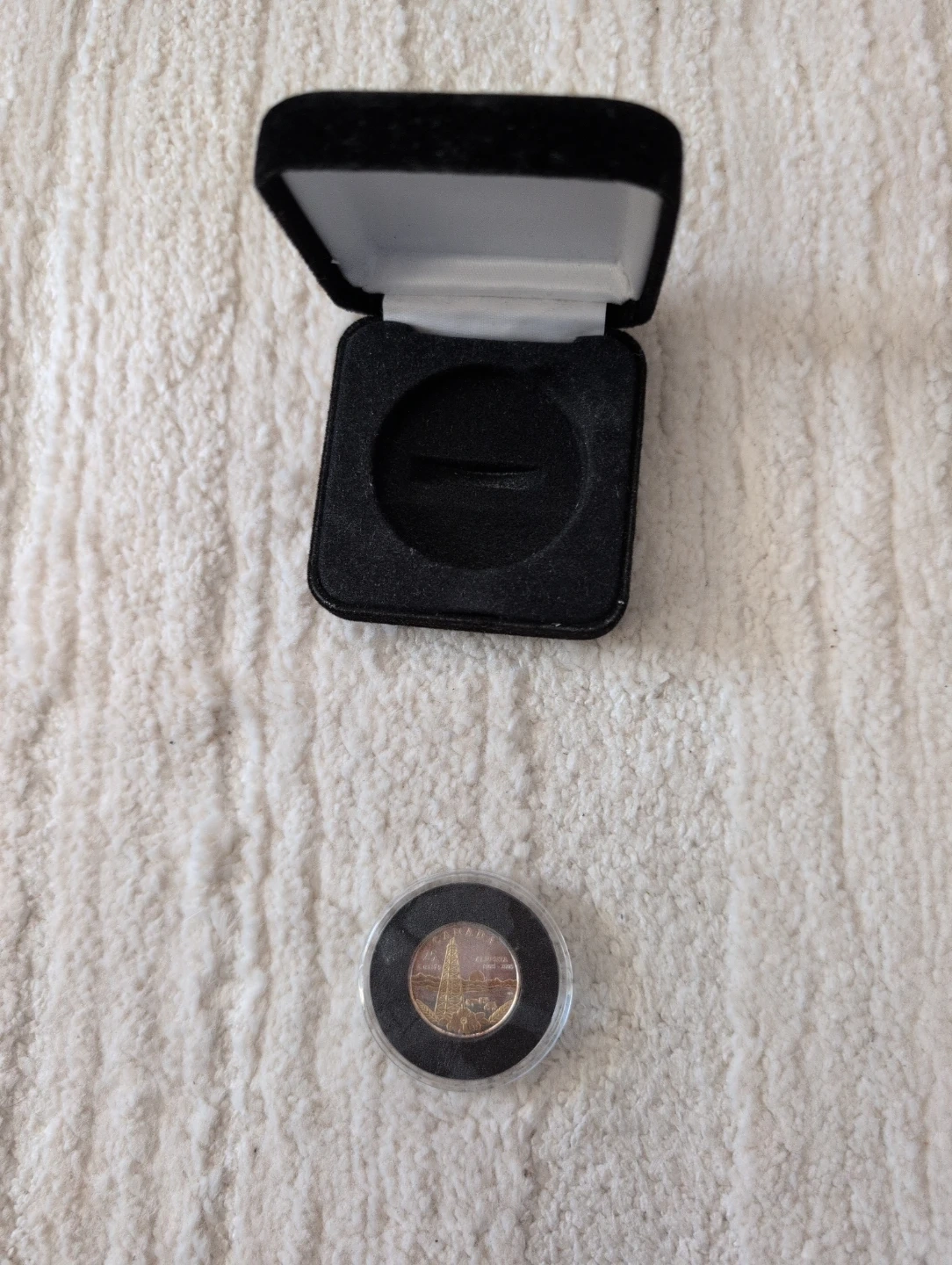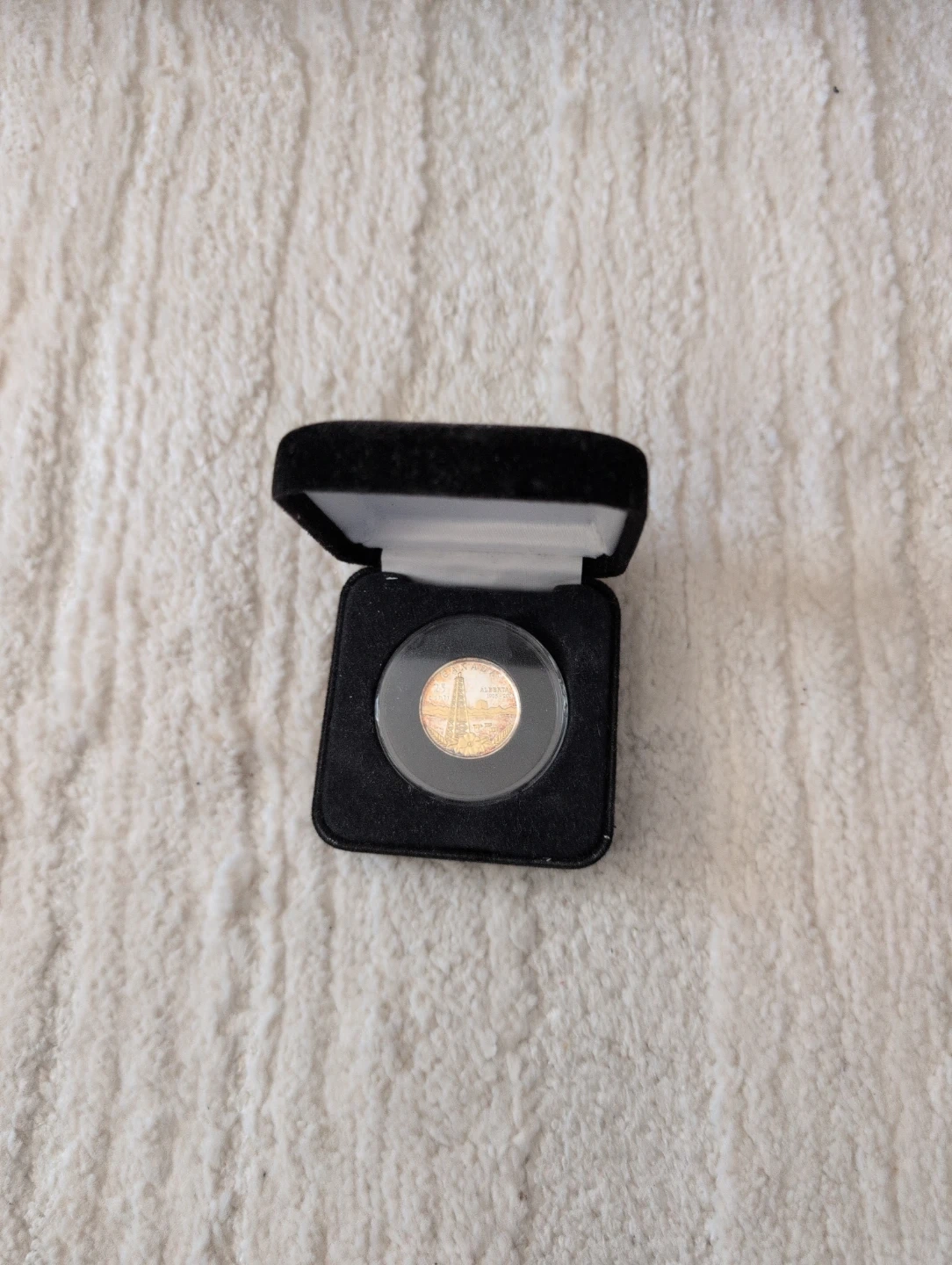This is a commemorative coin presented in a black velvet-lined box. The coin features an image of the first oil derrick, it commerates Albertas 100 year Anniversary. It's a nice collectible piece. Someone might buy this for its historical or decorative value.