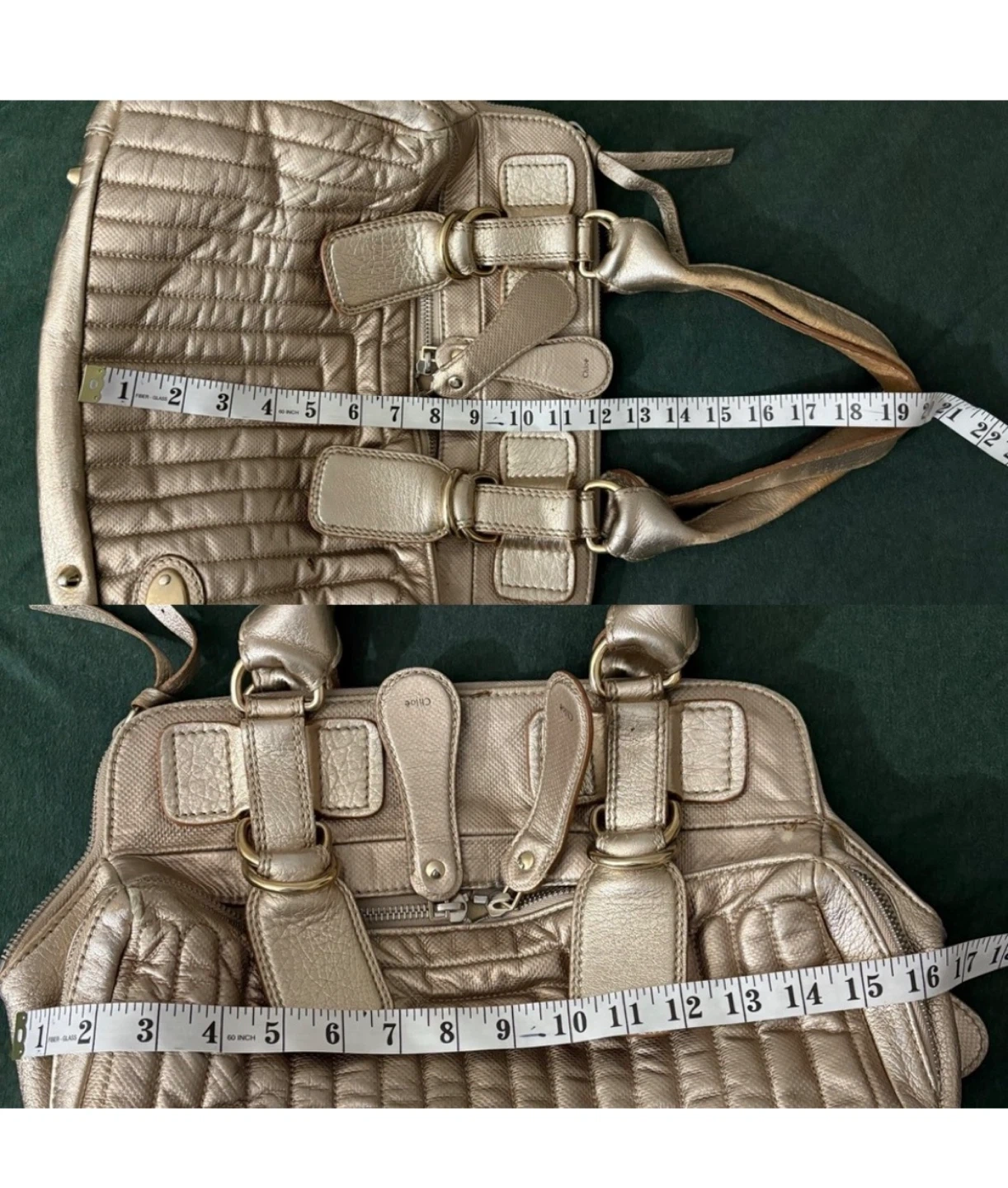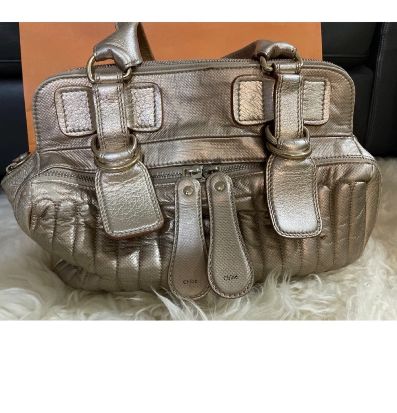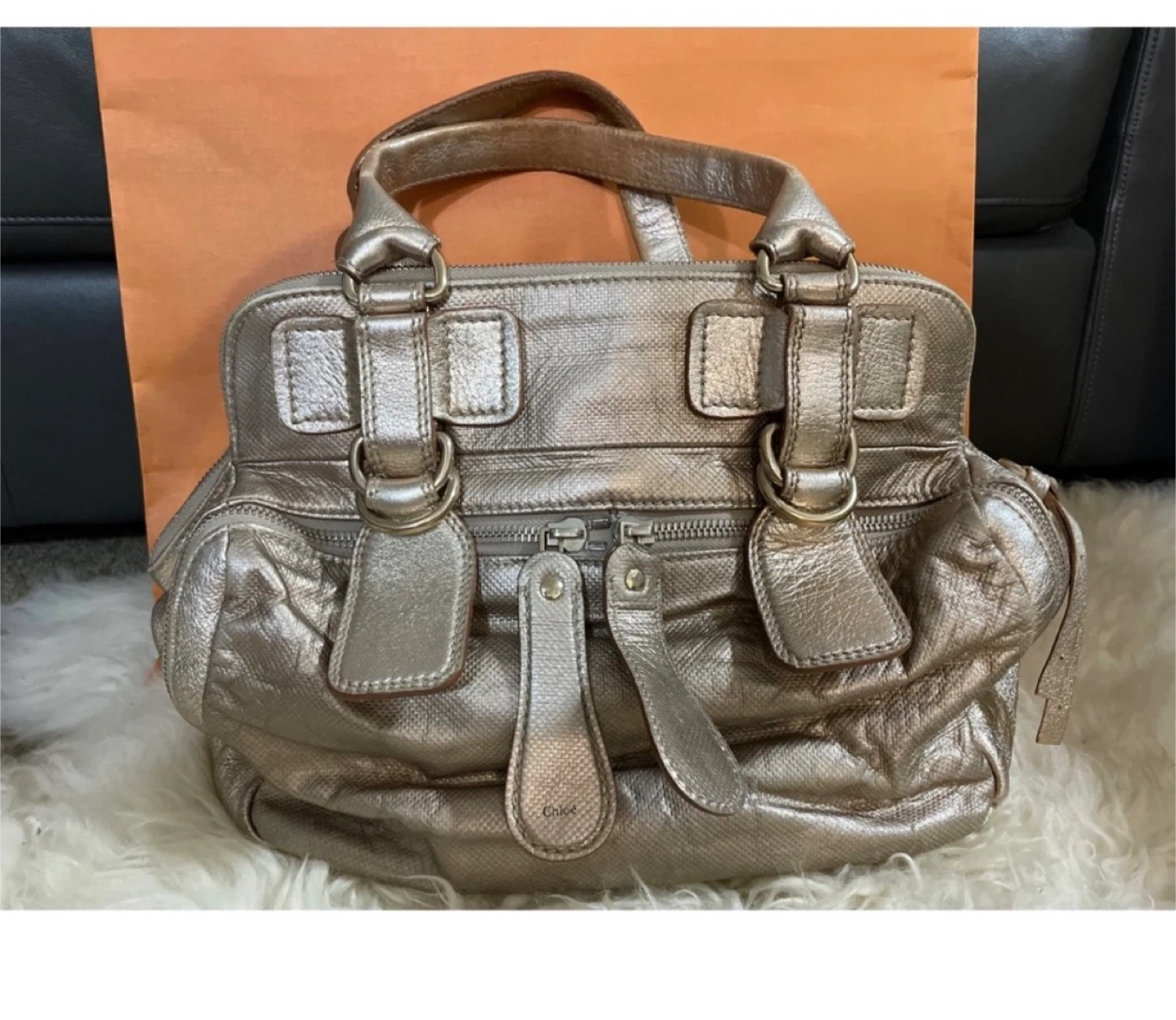A classic Chloe Bay satchel in a metallic bronze colour. It's made from leather. This bag is spacious and perfect for everyday use. Some stain and tear in the interior. Pickup Cambie road Richmond