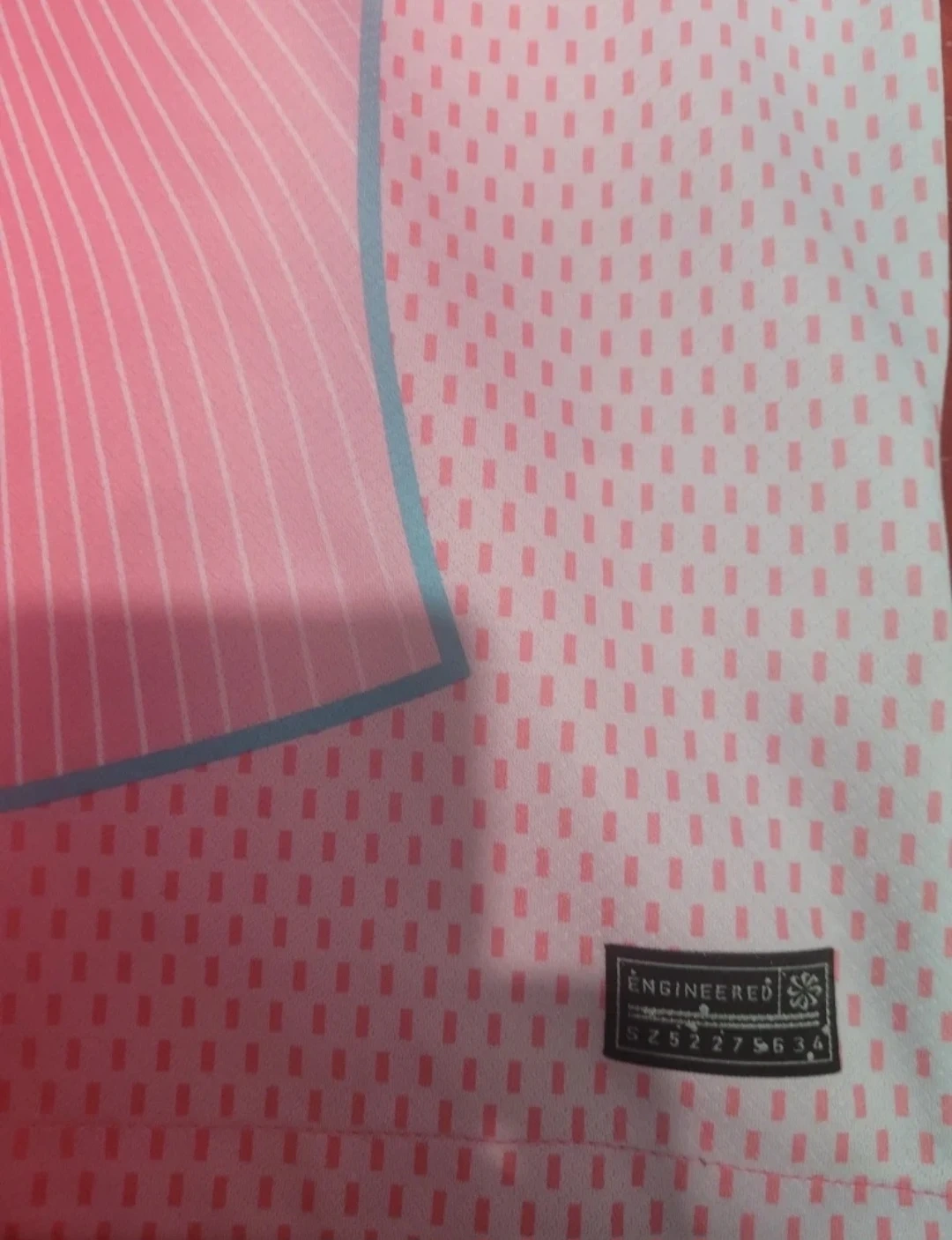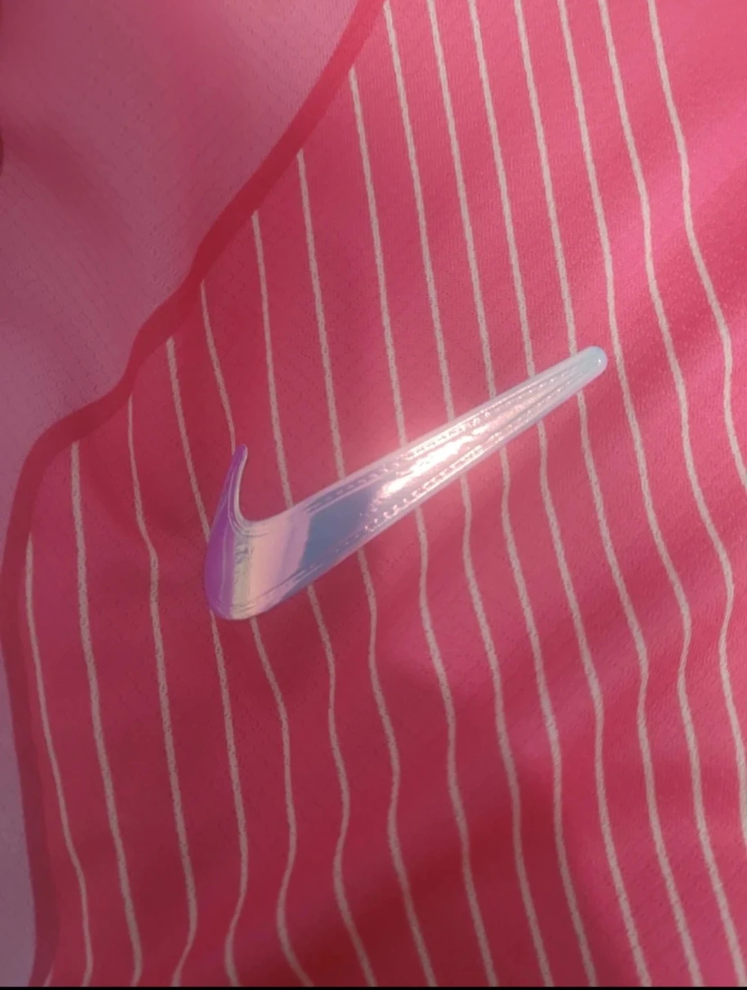 This is a Nike FC Barcelona 2023/24 third jersey in pink. It features the club crest, Spotify logo and champions league logo. Lightweight and breathable fabric. Men's L size.