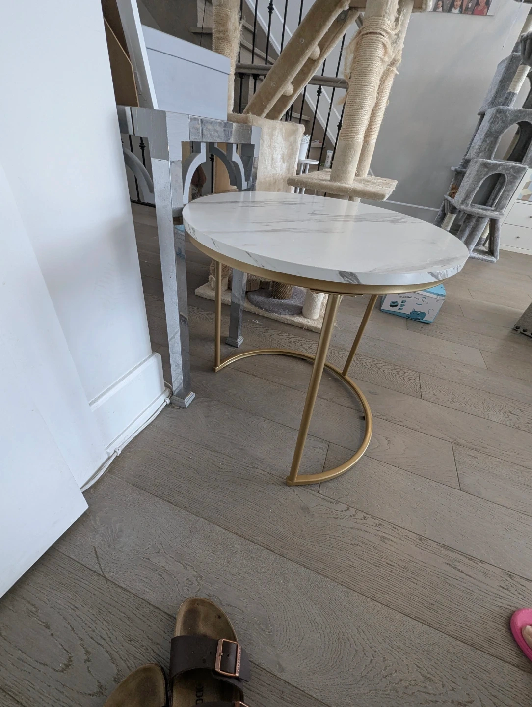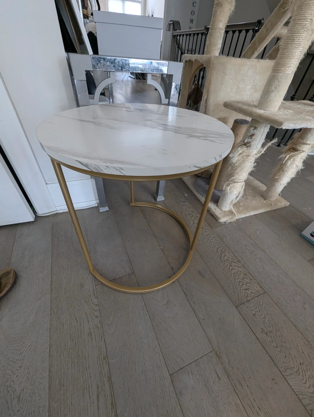 A modern accent table with a marble-look top and gold metal legs. This table's compact size makes it great for small spaces. Its curved base adds a stylish touch.
