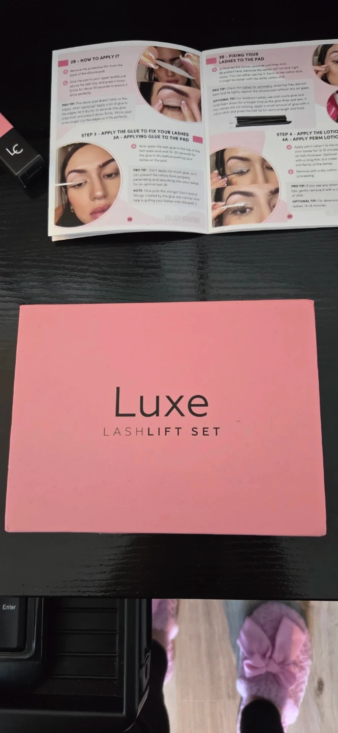 This is the Luxe Lash Lift Set for achieving dream lashes. It includes adhesive, perm lotion, fix lotion, and nourish lotion. Applicators are also included. 3 application included.