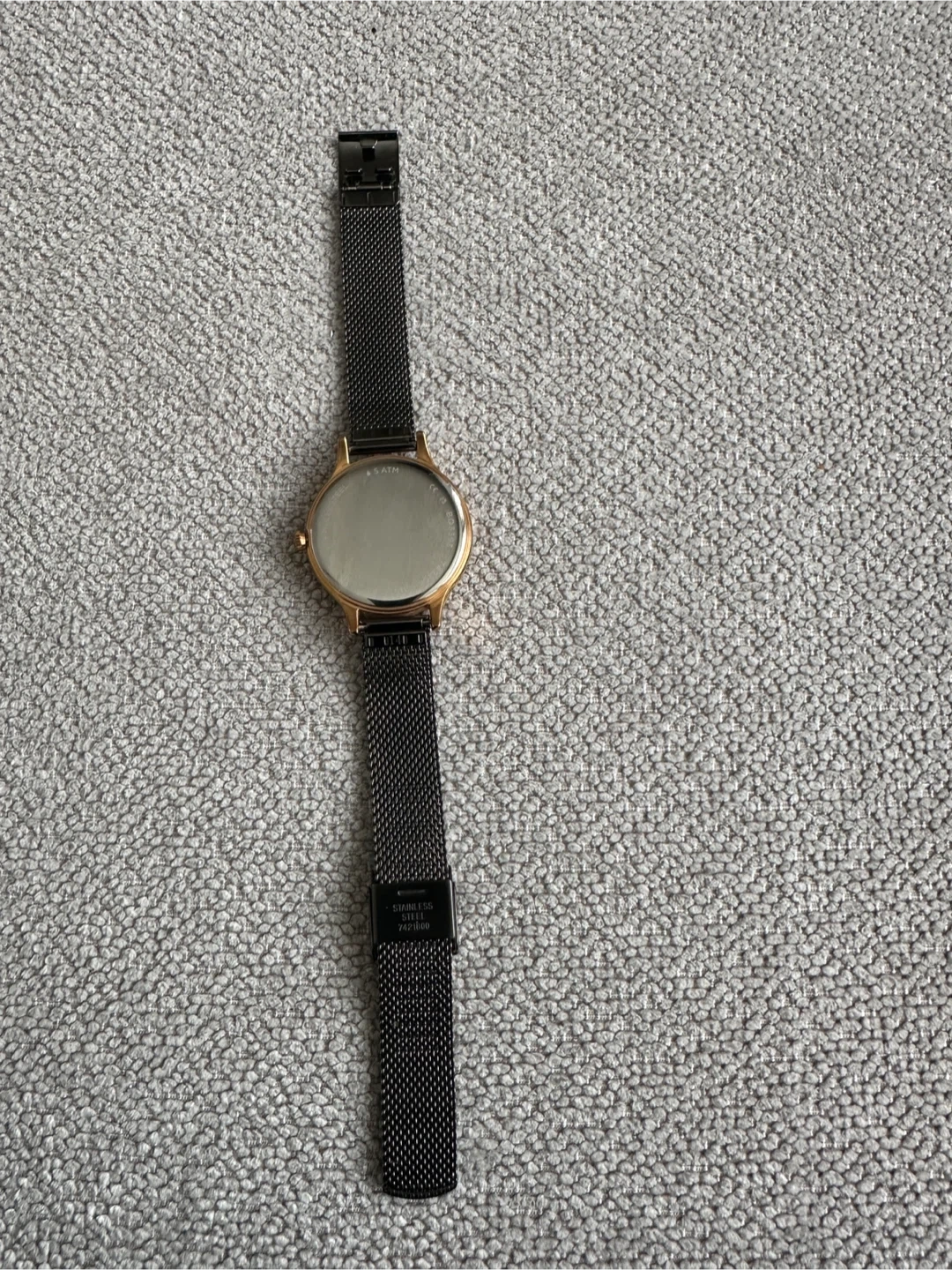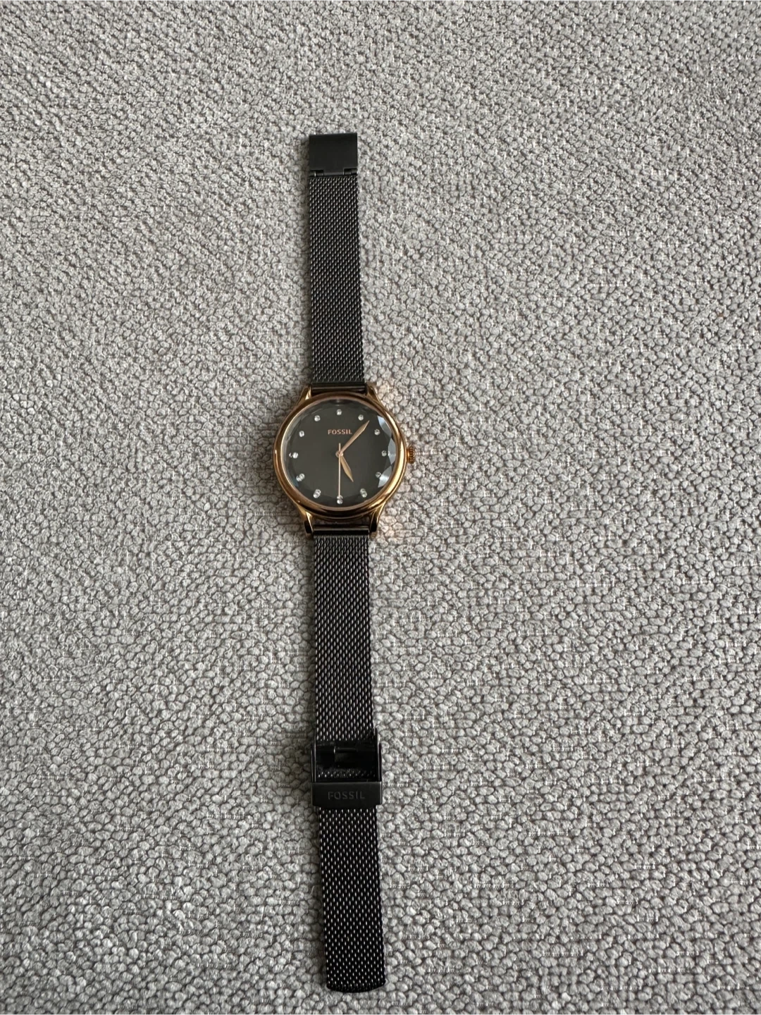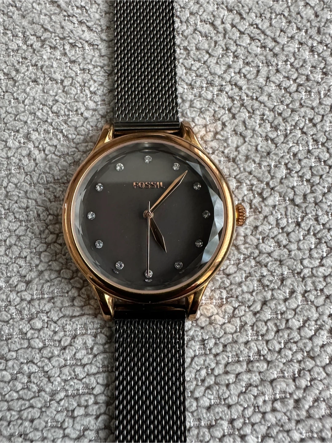 This Fossil watch has a rose gold tone case and a dark grey dial with crystal markers. It features a black stainless steel mesh band for a sleek look. This timepiece is perfect for everyday wear.