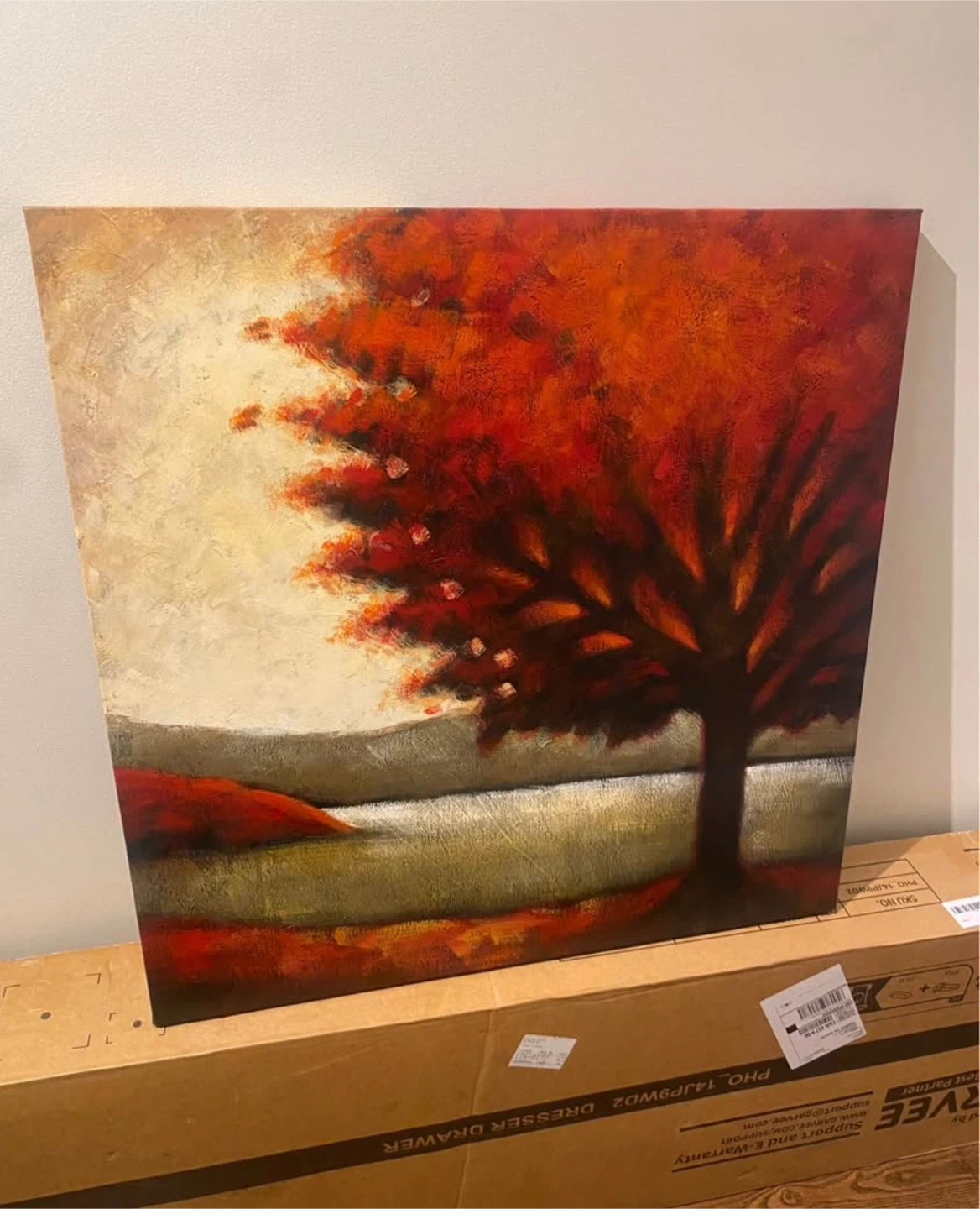 This is a beautiful canvas wall art featuring an abstract autumn tree. The colours are rich oranges and reds, with a soft beige background. It's a striking piece that'll add warmth to any room!