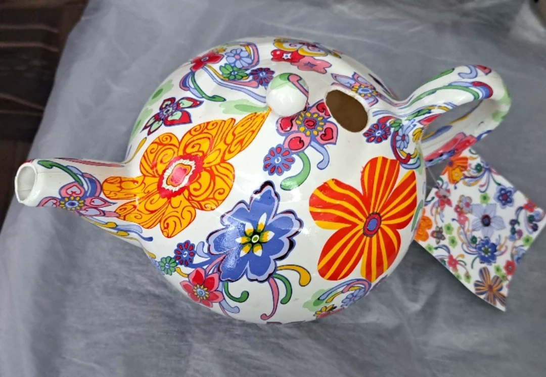 Brand New Hand-painted ceramic watering can. Features a floral design.