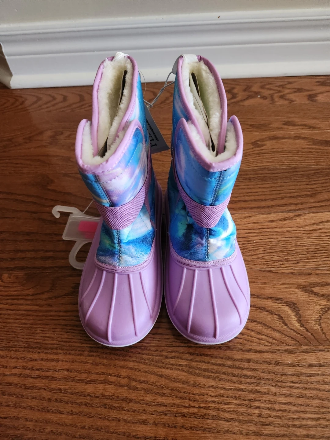 These kids' winter boots feature a colourful tie-dye design with a purple rubber foot. They're lined with warm, fuzzy material to keep little feet toasty. Perfect for staying warm and dry during snowy days!