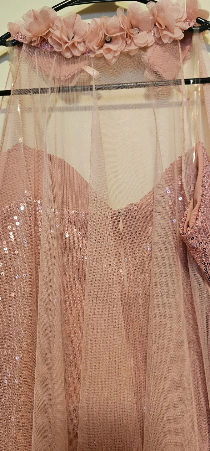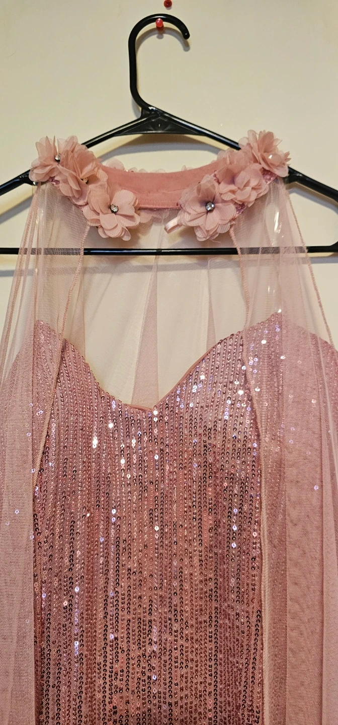 This sparkly pink sequin dress comes with a matching tulle cape. The cape has delicate flower and gem accents around the neckline. It's perfect for special occasions!
