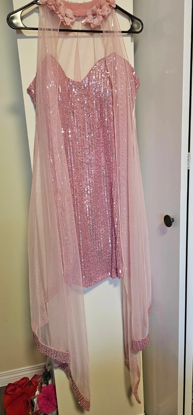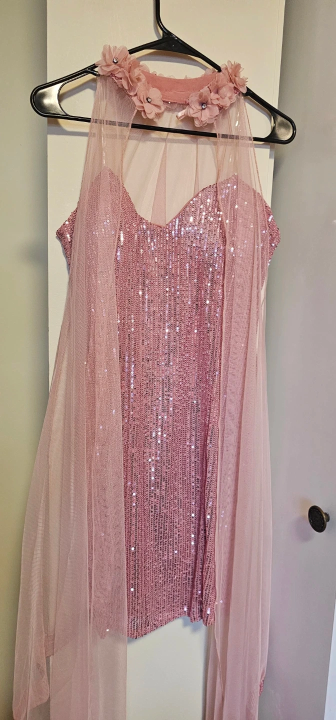 This sparkly pink sequin dress comes with a matching tulle cape. The cape has delicate flower and gem accents around the neckline. It's perfect for special occasions!