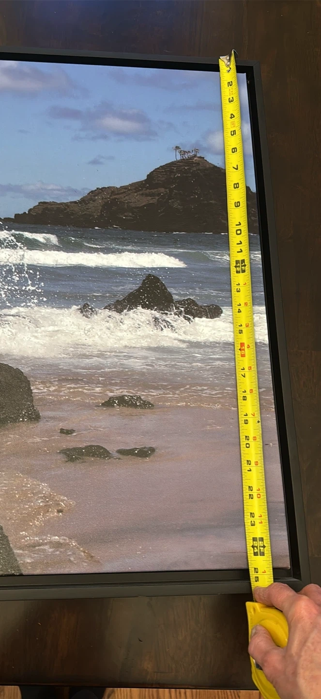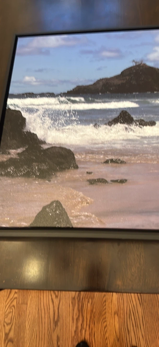 This framed wall art depicts a scenic coastal landscape with waves crashing on the shore. It's approximately 19 inches wide and 24 inches tall. Features a sawtooth hanger for easy mounting. It's ready to add a touch of the ocean to your space! See photo of metal hanger support bracket on back of frame in my ad.