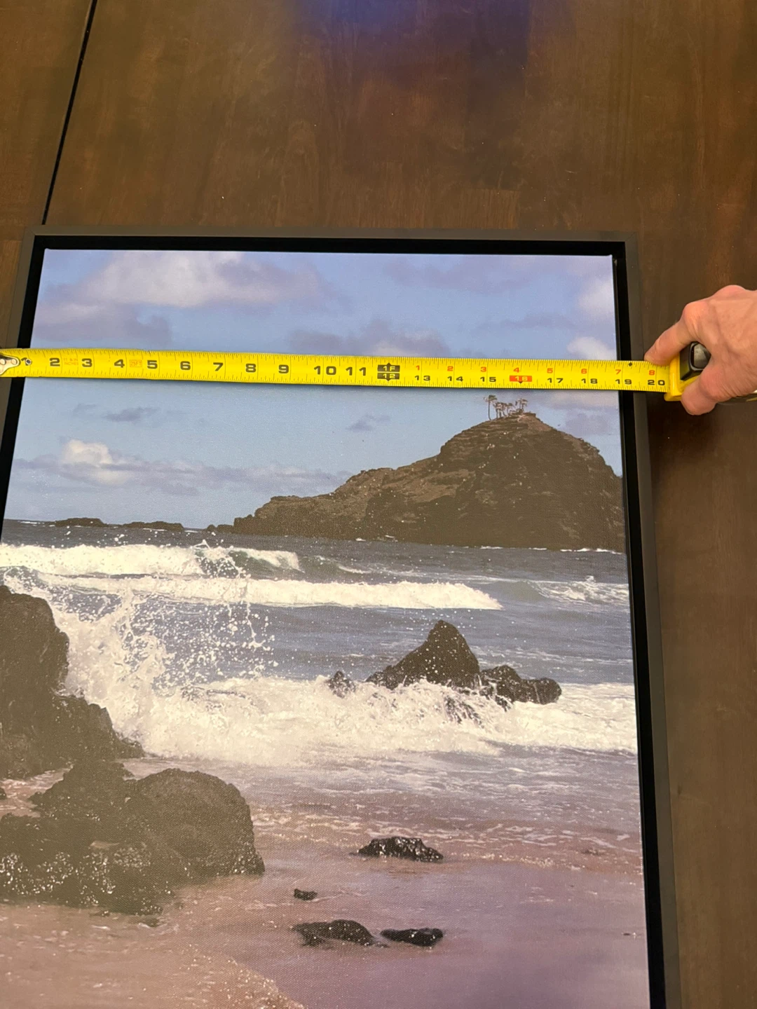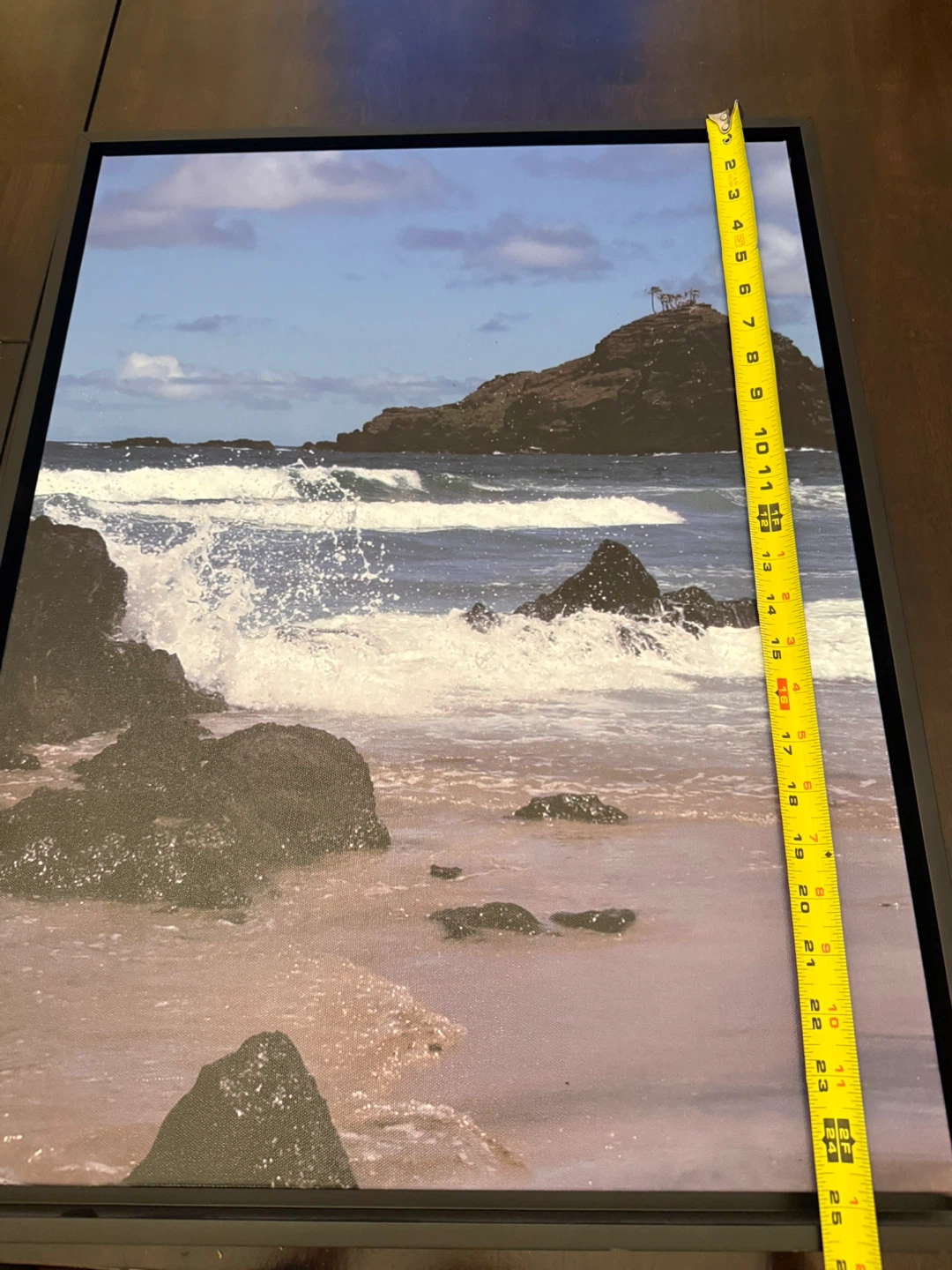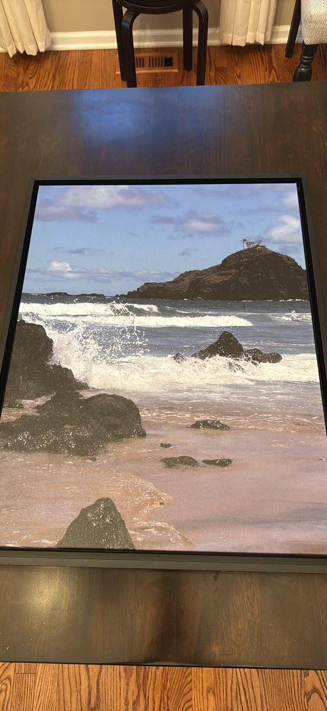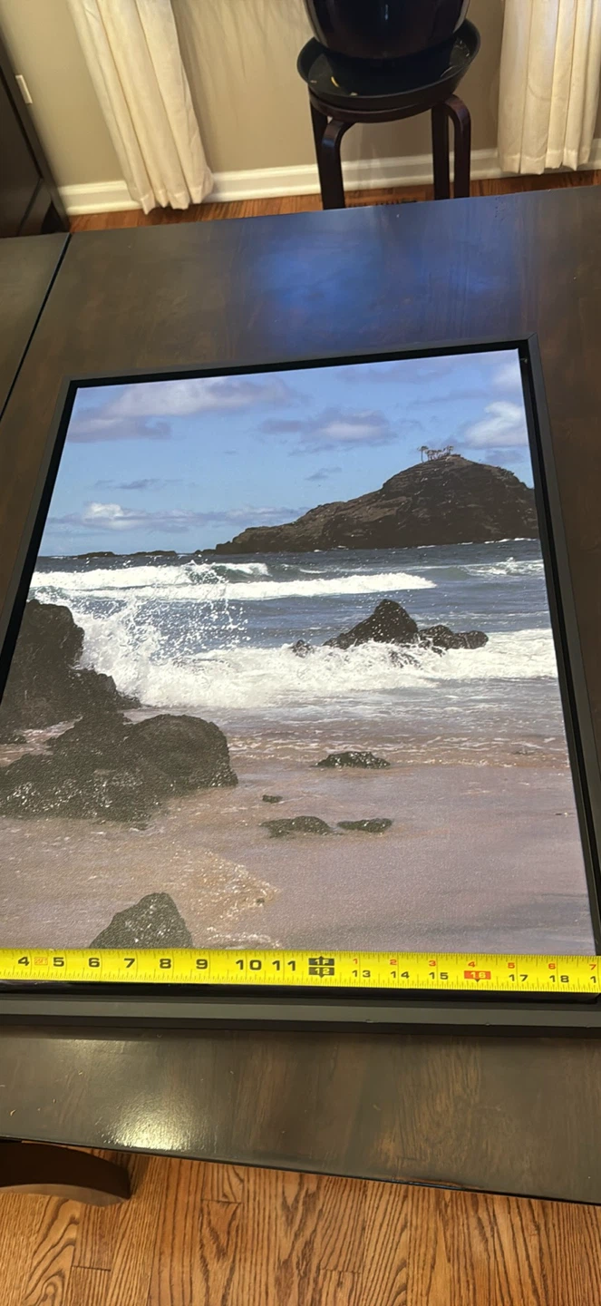 This framed wall art depicts a scenic coastal landscape with waves crashing on the shore. It's approximately 19 inches wide and 24 inches tall. Features a sawtooth hanger for easy mounting. It's ready to add a touch of the ocean to your space! See photo of metal hanger support bracket on back of frame in my ad.