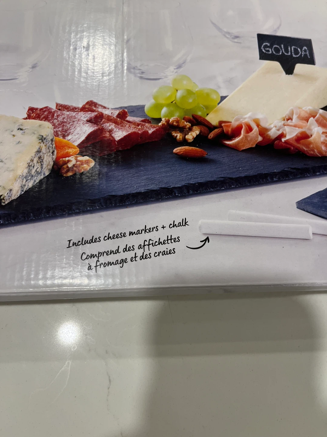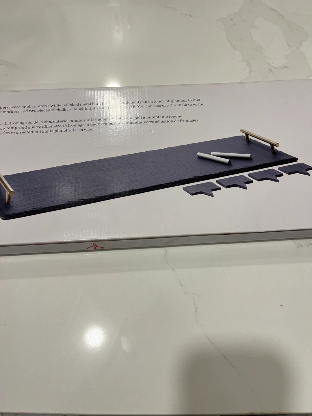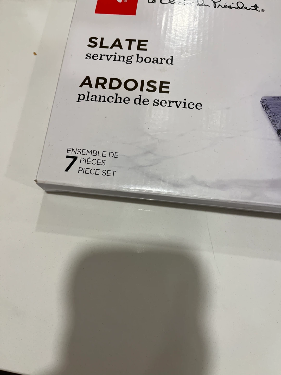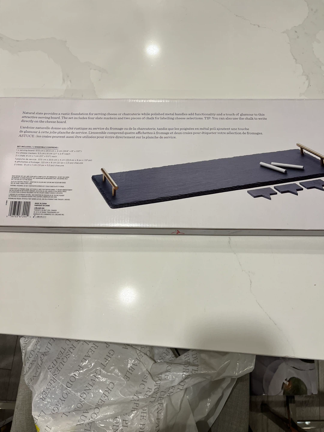 Selling a President's Choice slate serving board set. It's a 7-piece set, perfect for entertaining! Includes cheese markers and chalk for labeling cheeses or charcuterie. Add a touch of quality and glamour to your serving experience - brand new never opened